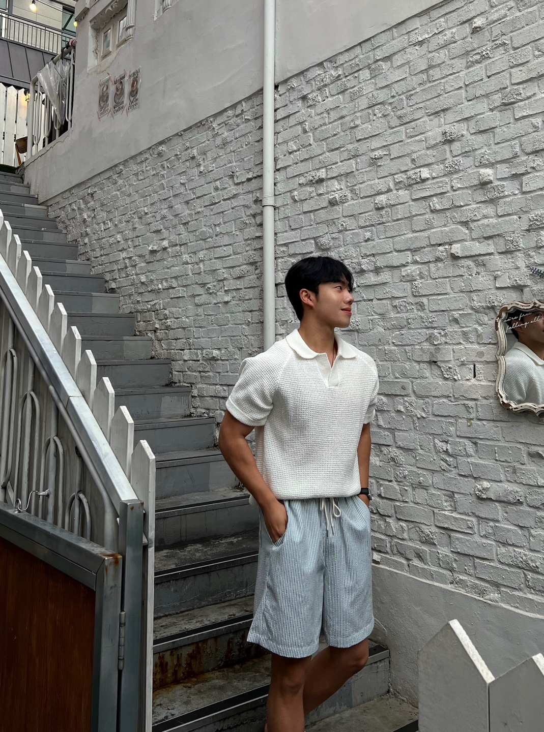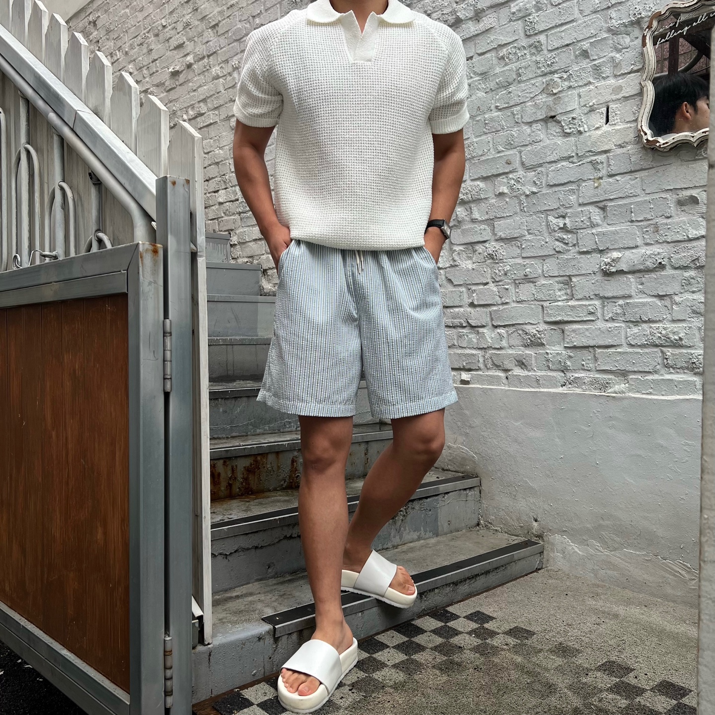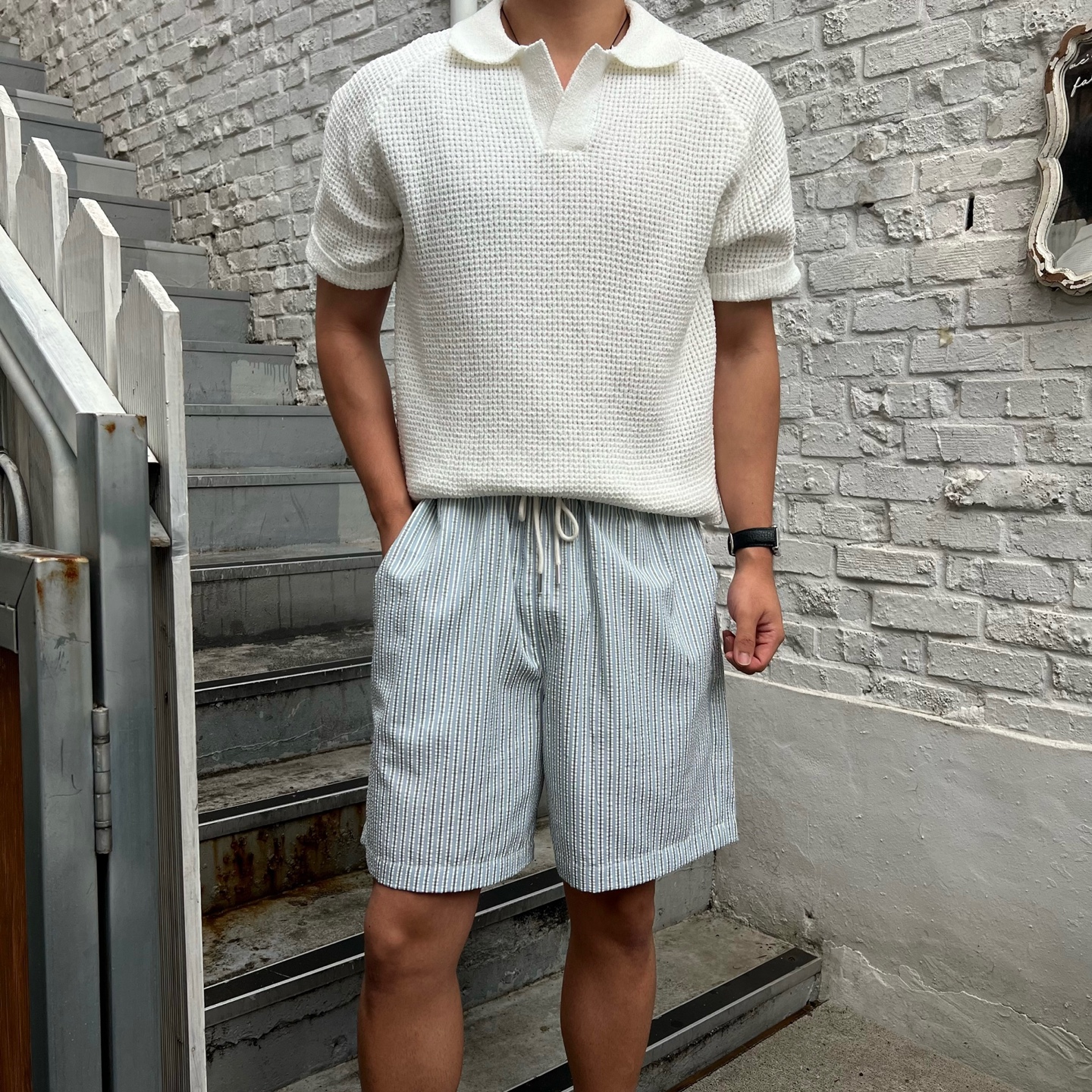 - 와플느낌의 조직으로 편직하며, 오픈 카라로 시원한 느낌