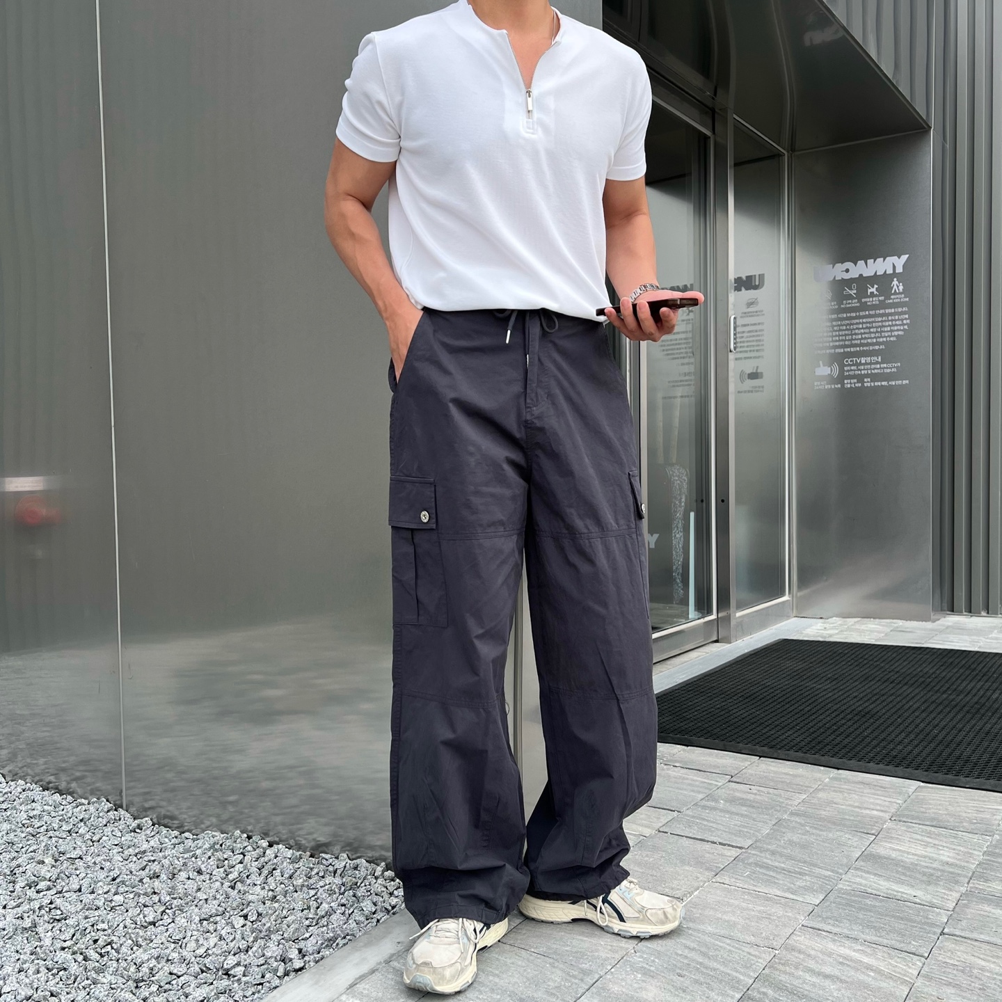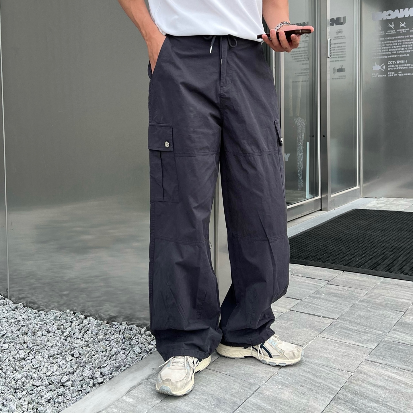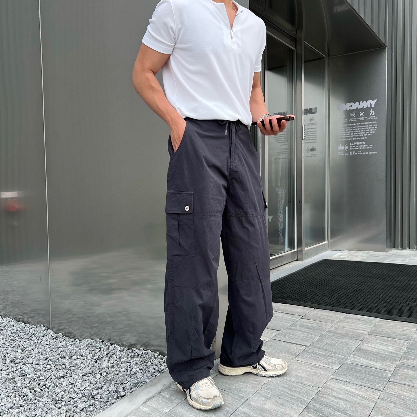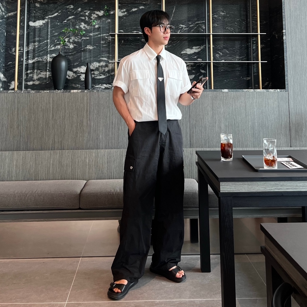 - 프론트와 백포켓 모두 실용적인 스퀘어 포켓 디자인으로 유틸리티 무드 강조