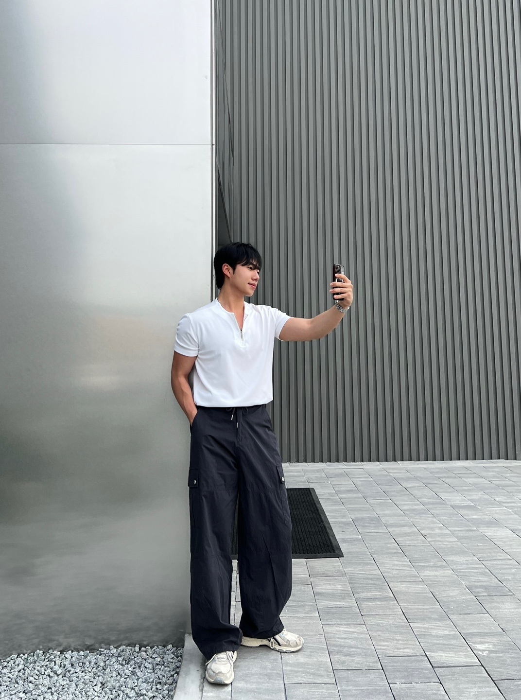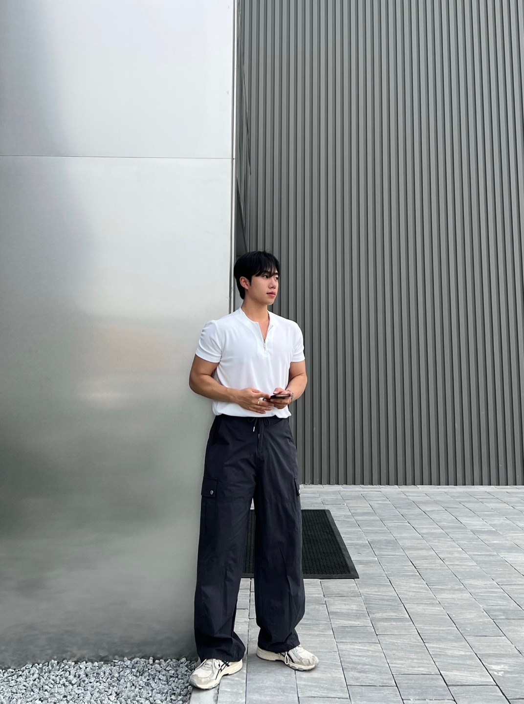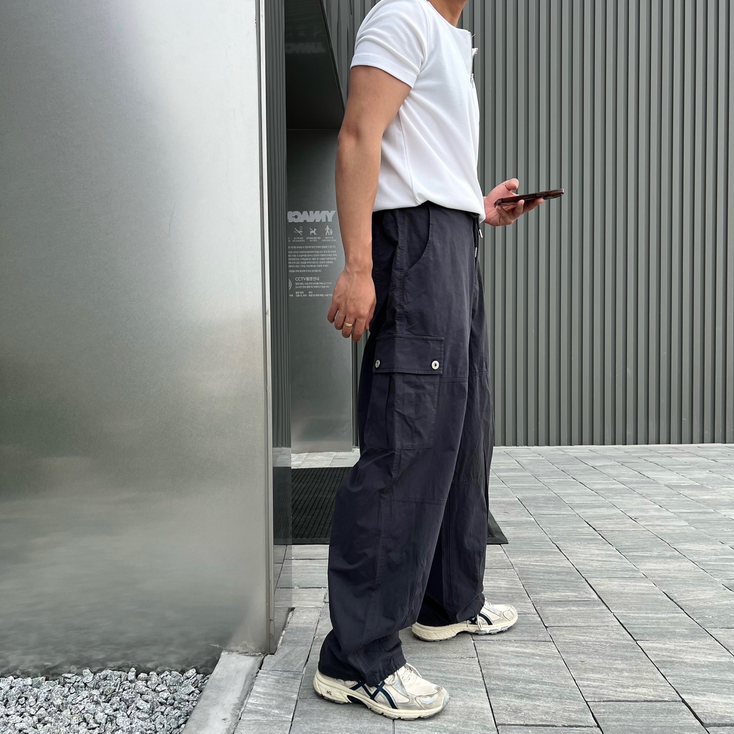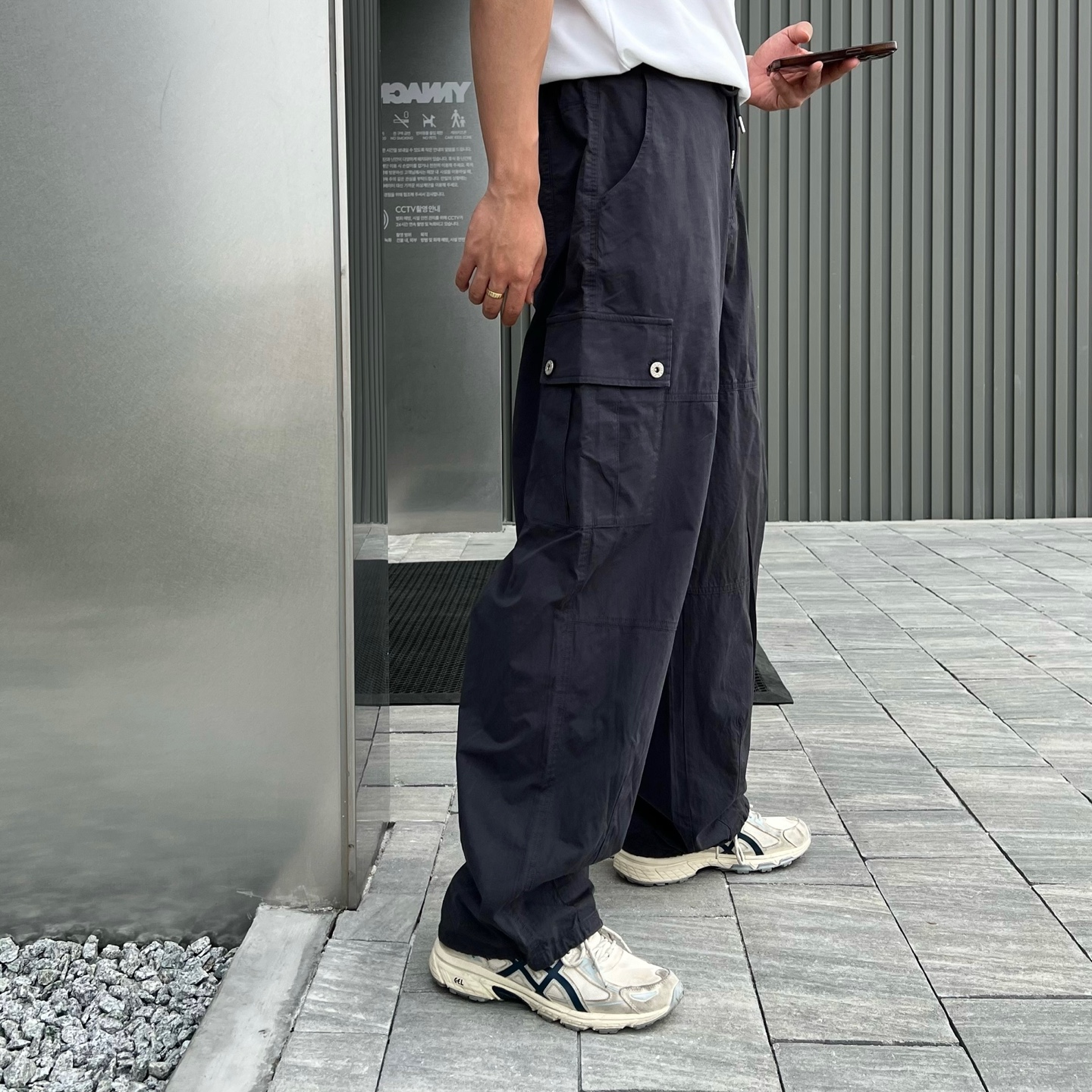 - 프론트와 백포켓 모두 실용적인 스퀘어 포켓 디자인으로 유틸리티 무드 강조