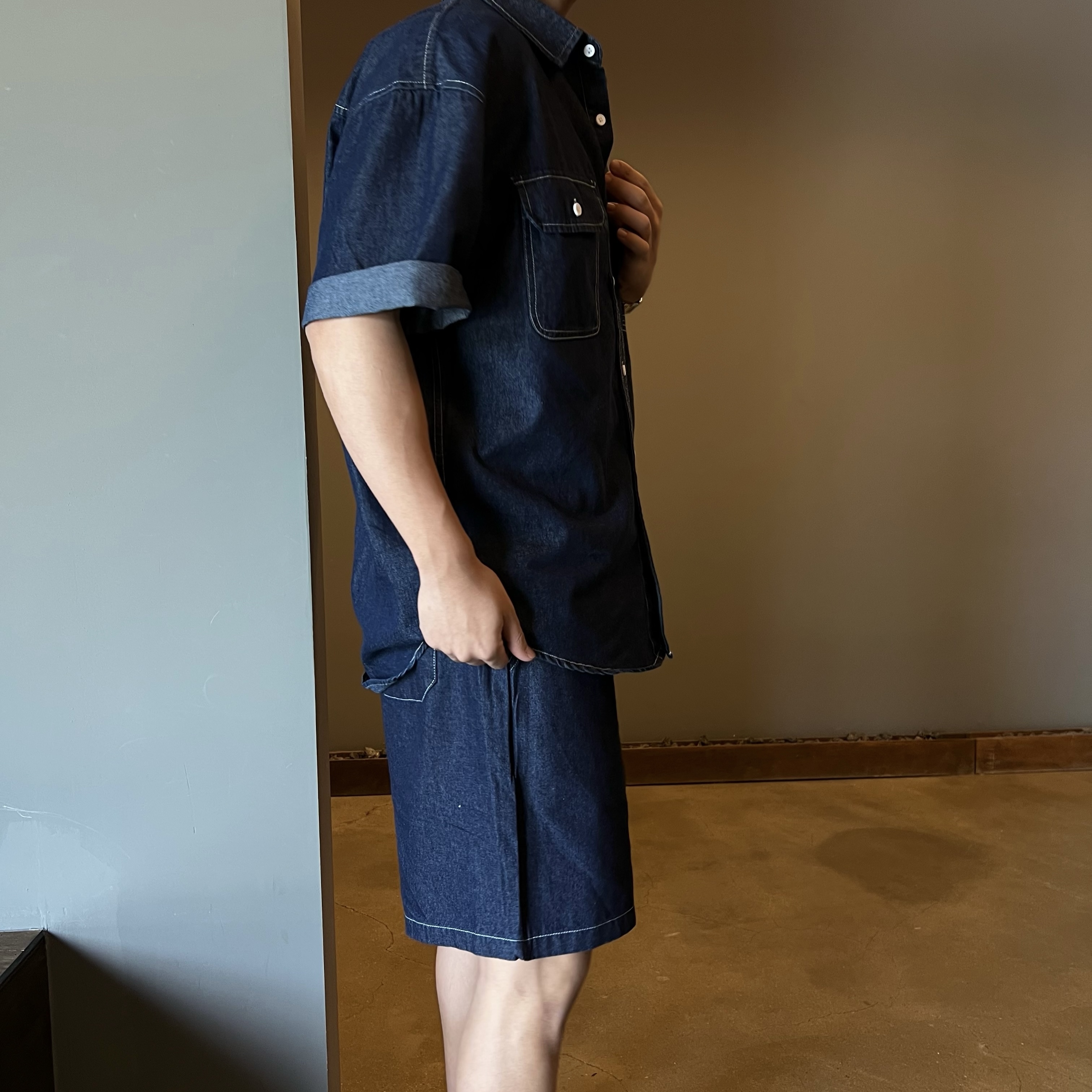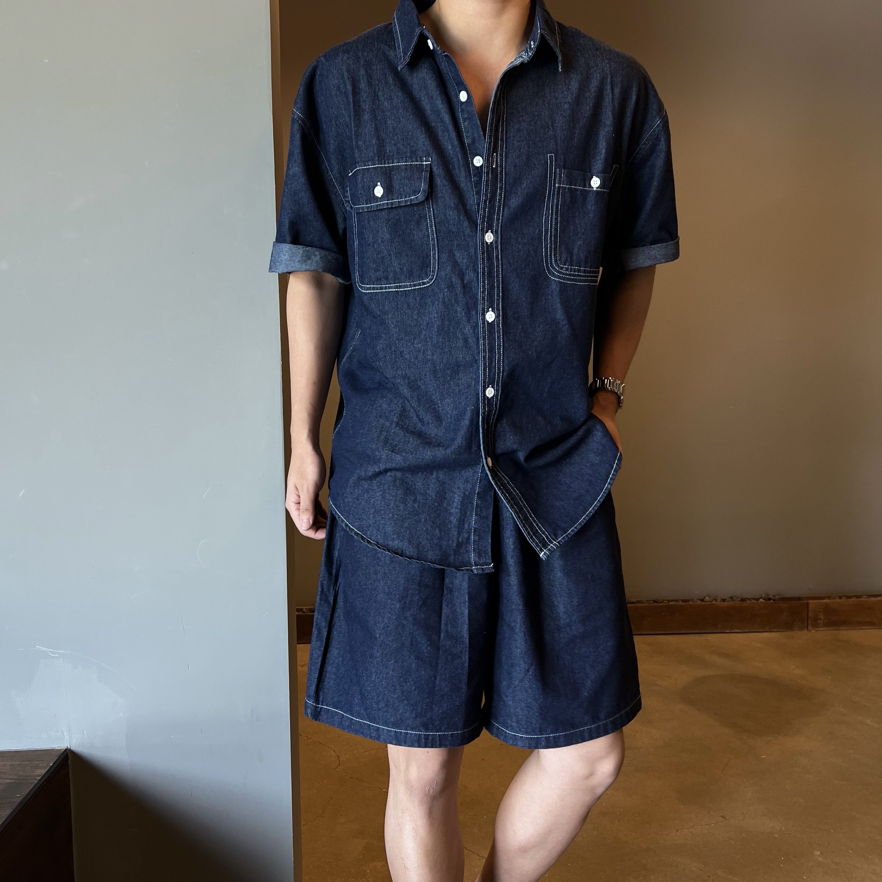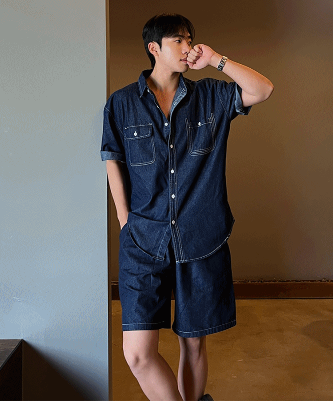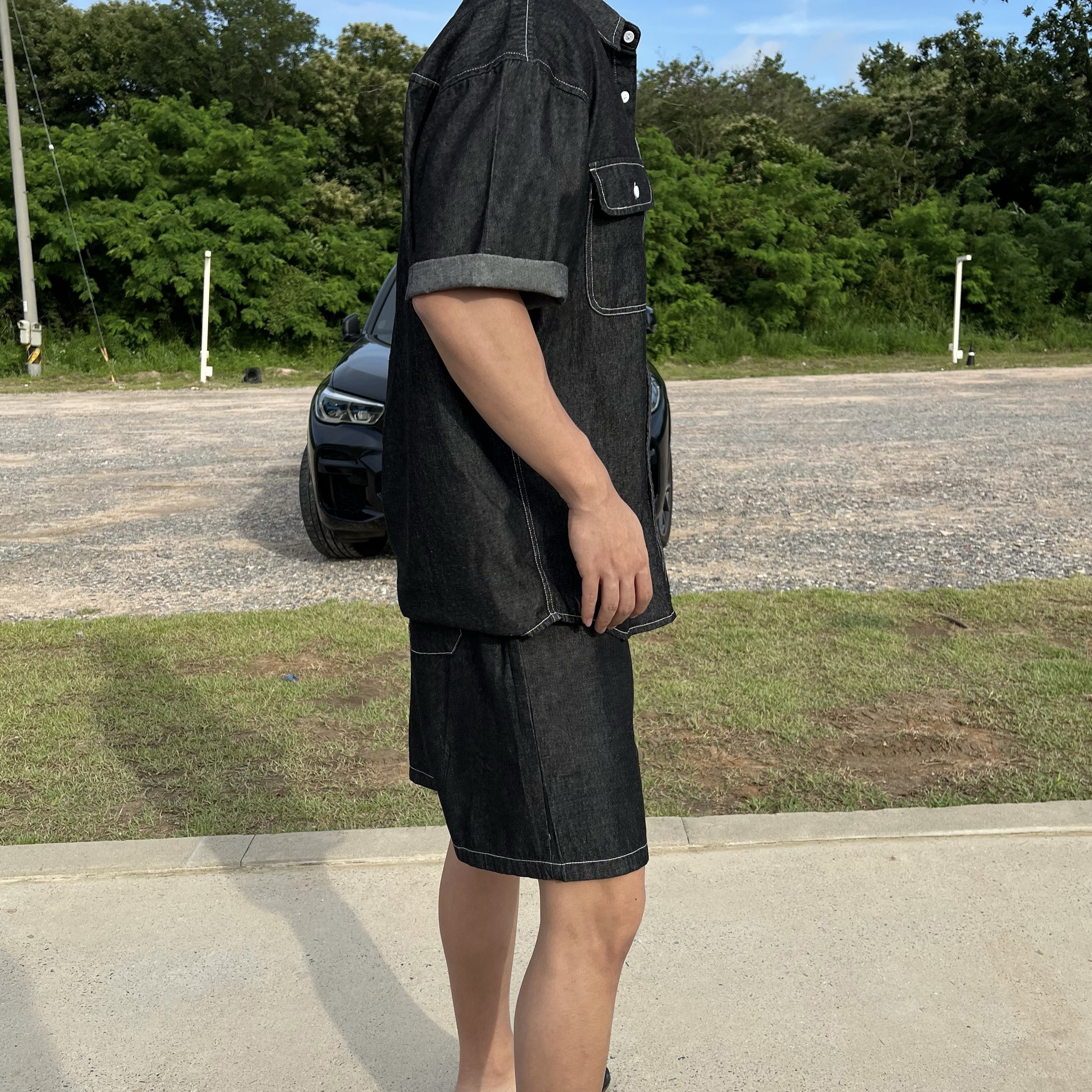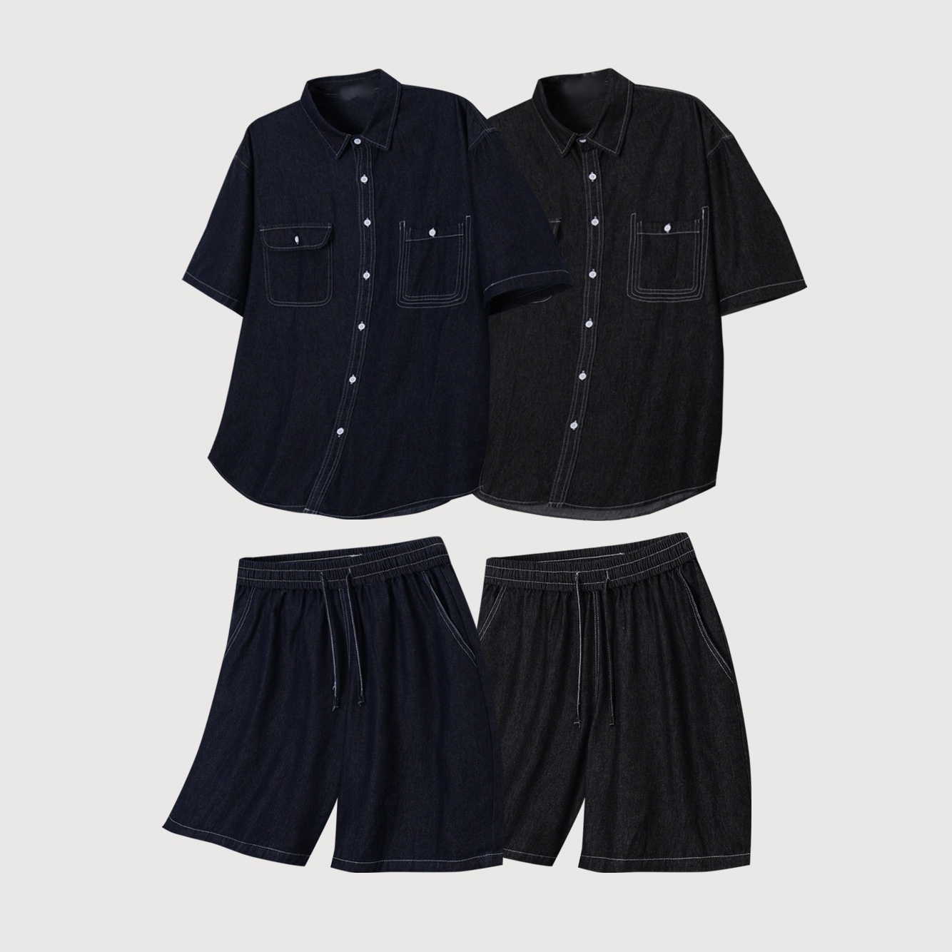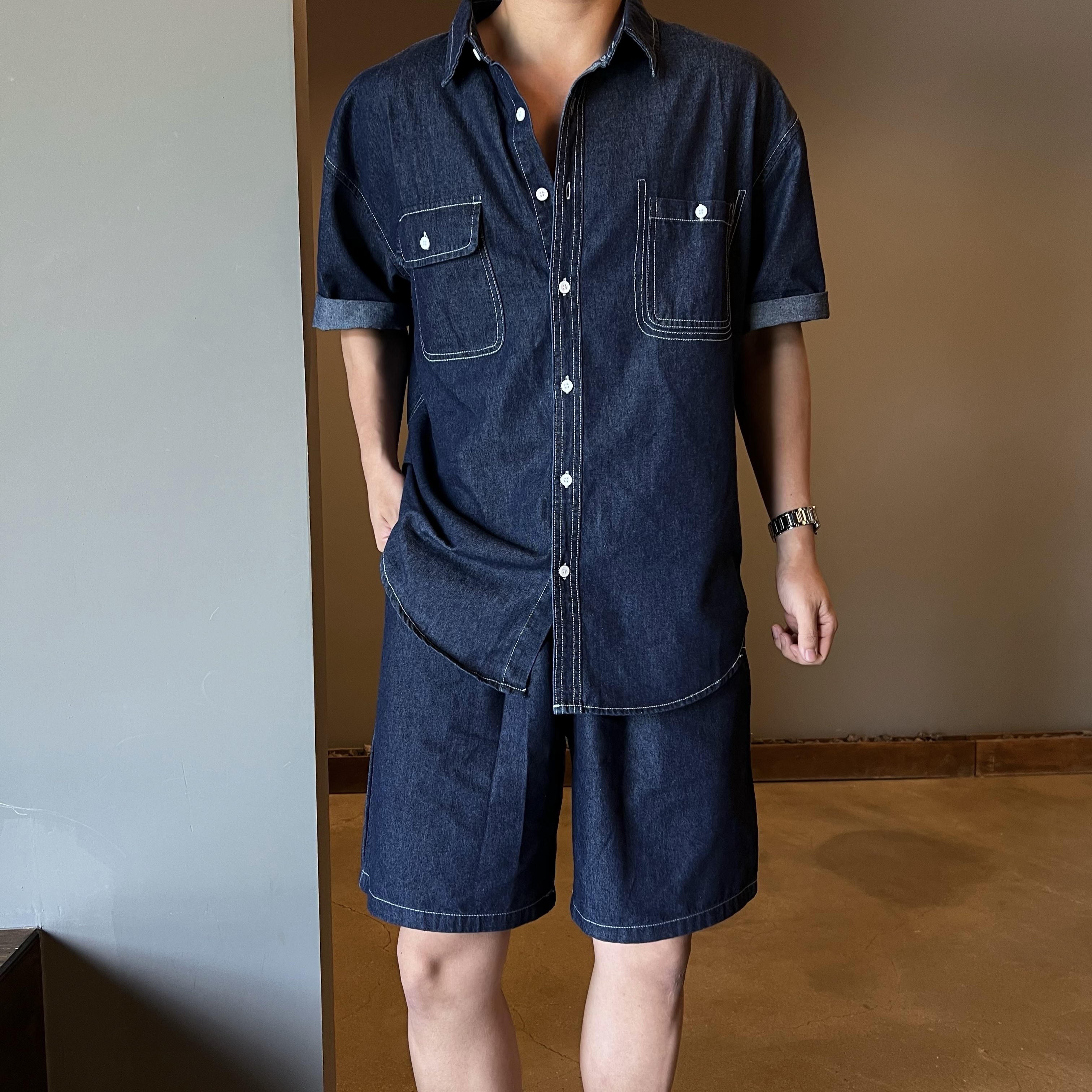- 트렌디한 올데님 셋업 스타일 데님 원단으로 제작되어 감각적인 셋업 연출 가능