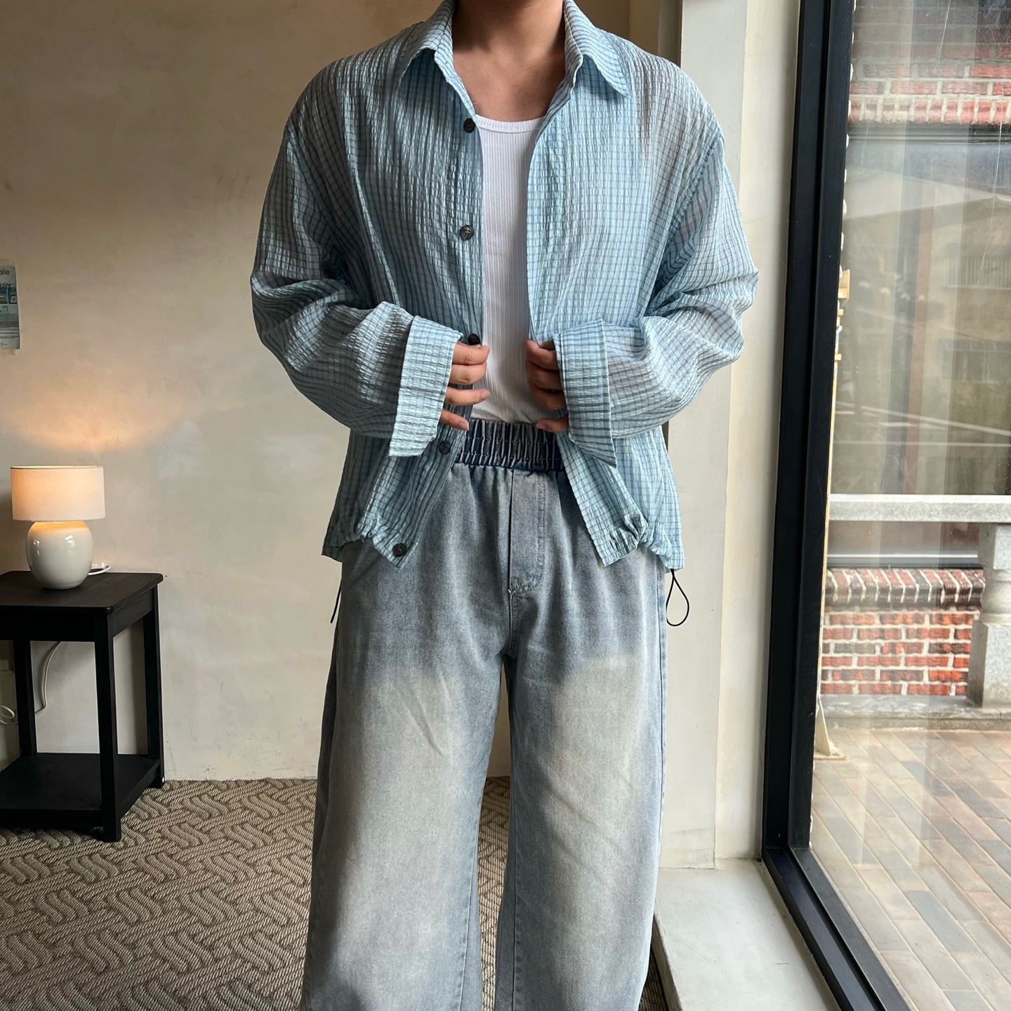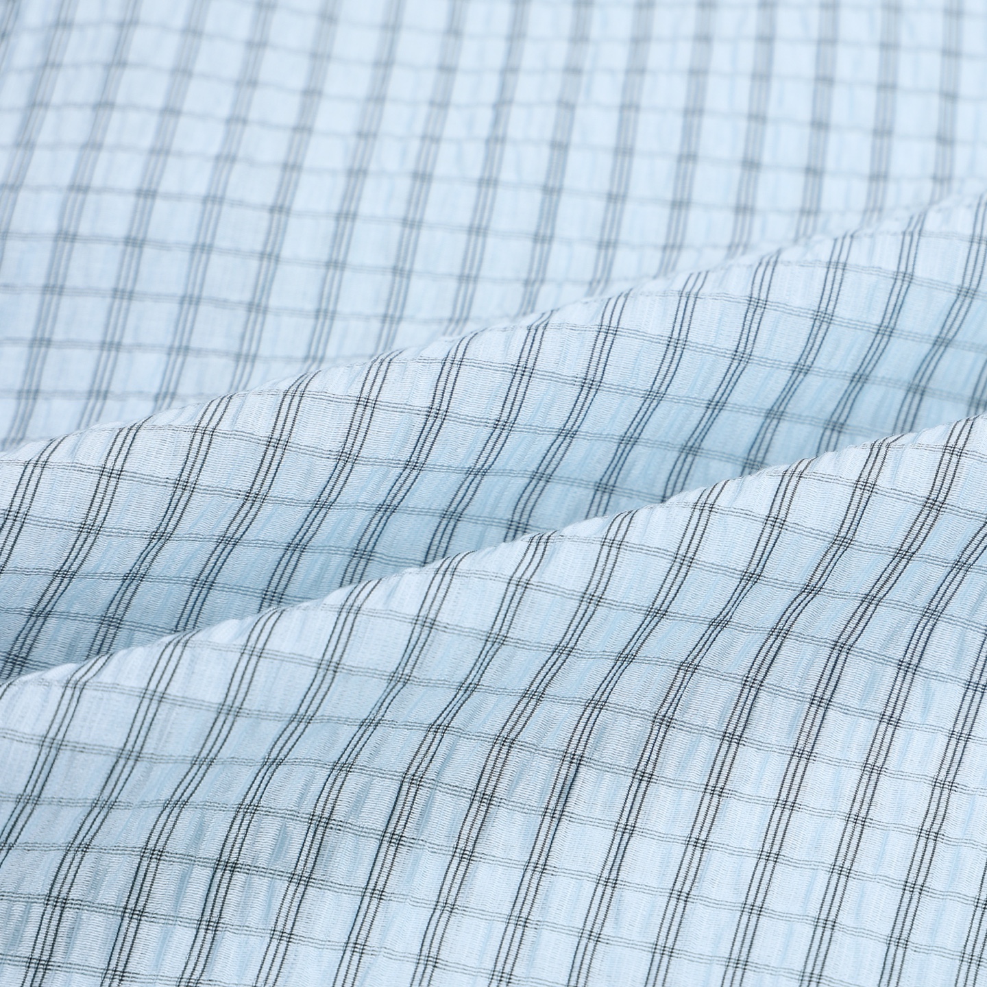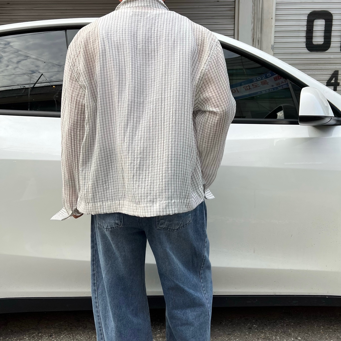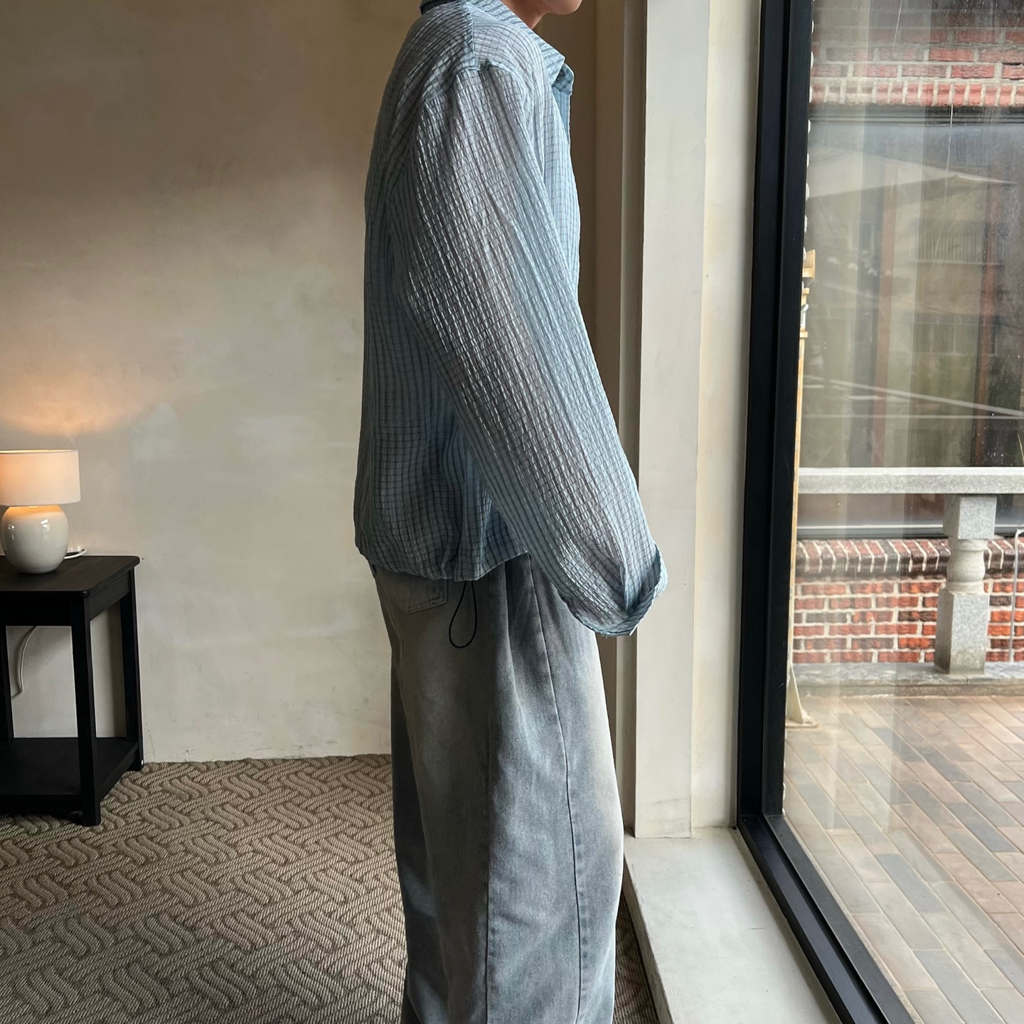 - 가볍고 드라이한 터치감의 크링클 체크 원단으로 제작되어 여름철에도 쾌적하게 착용 가능