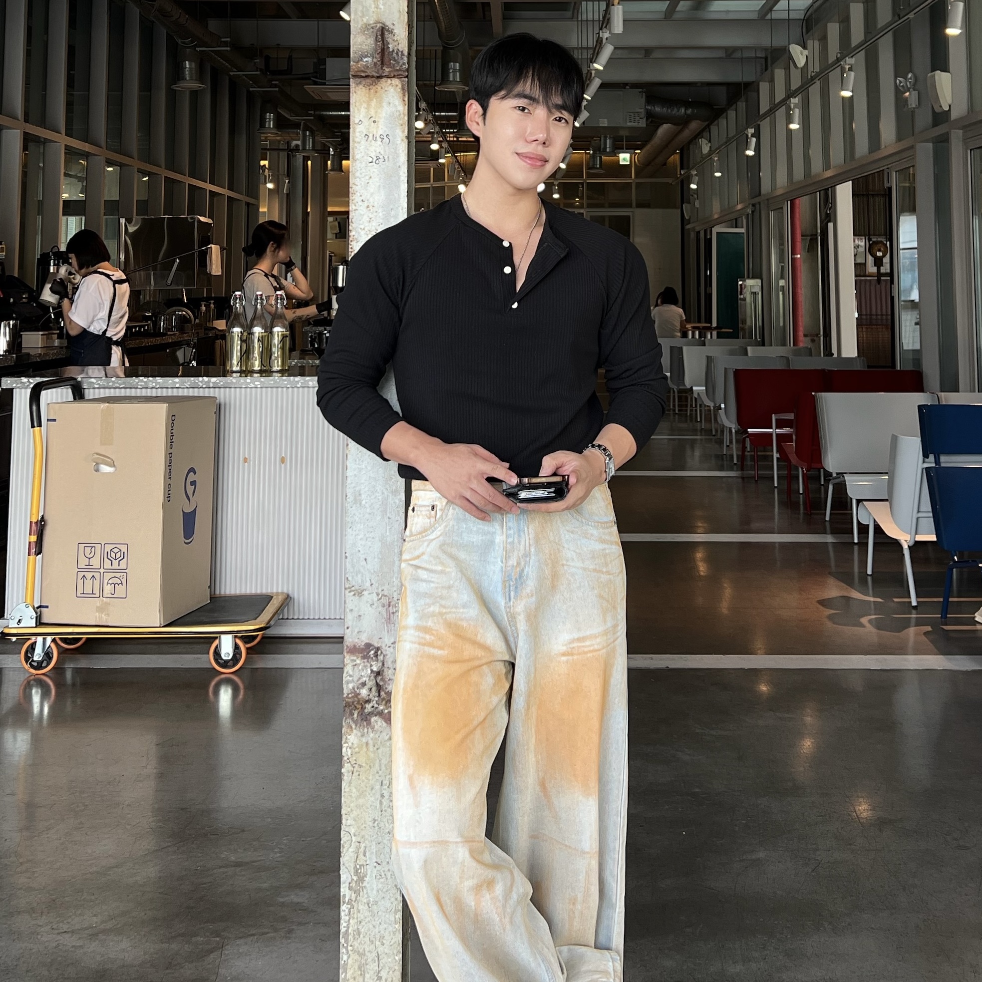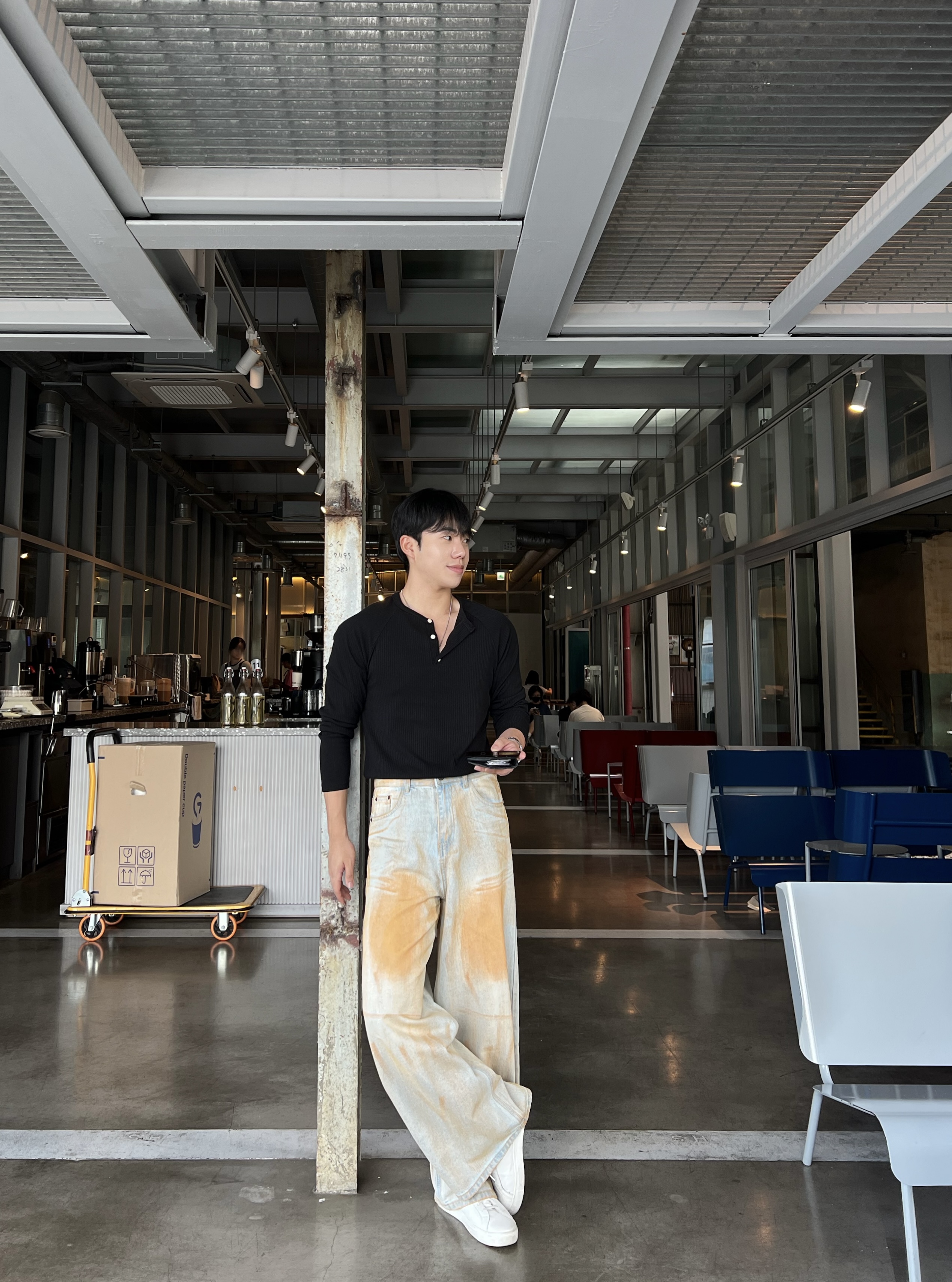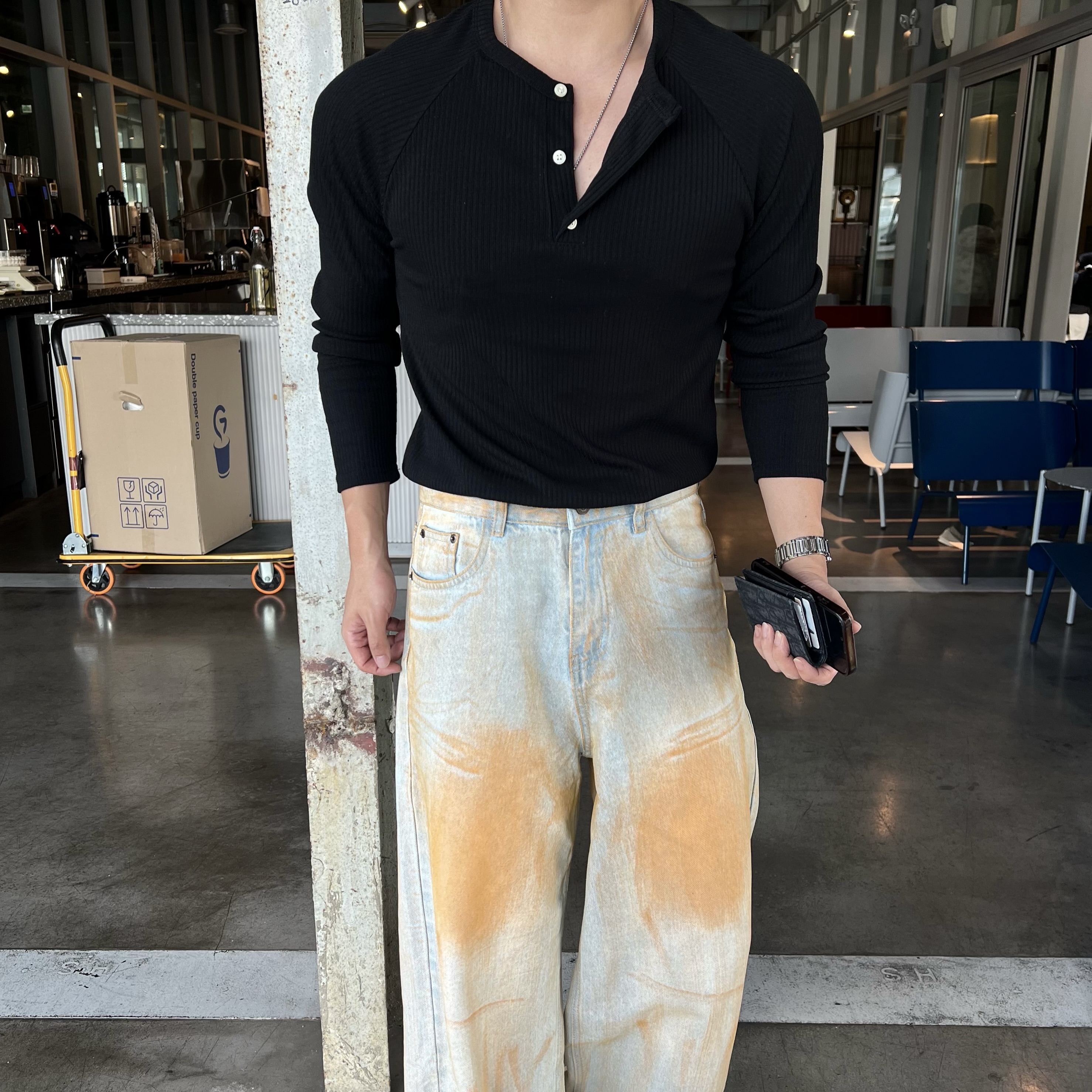 - 헨리넥 버튼 디테일로 베이직한 무드에 감각적인 포인트 더함
