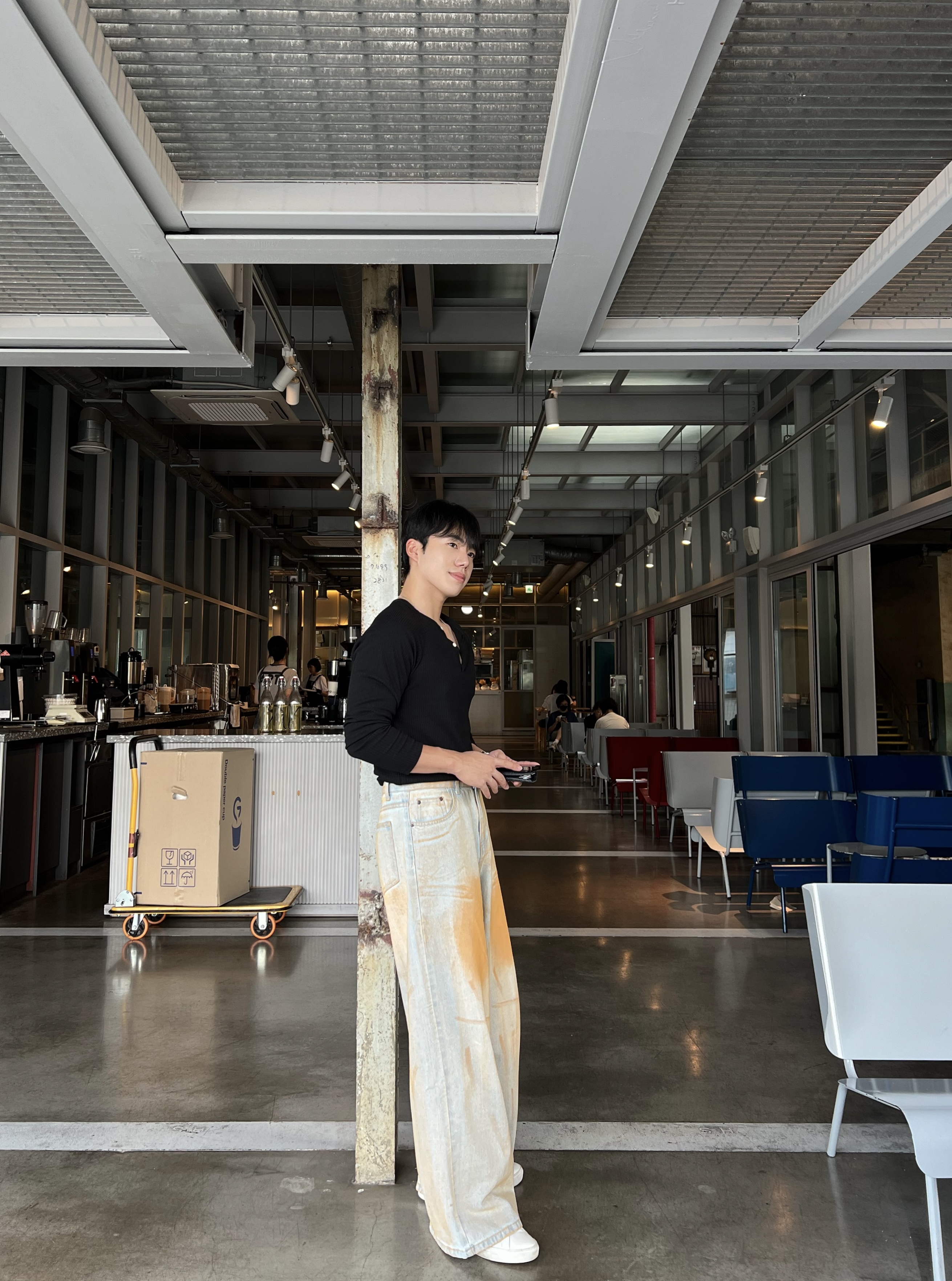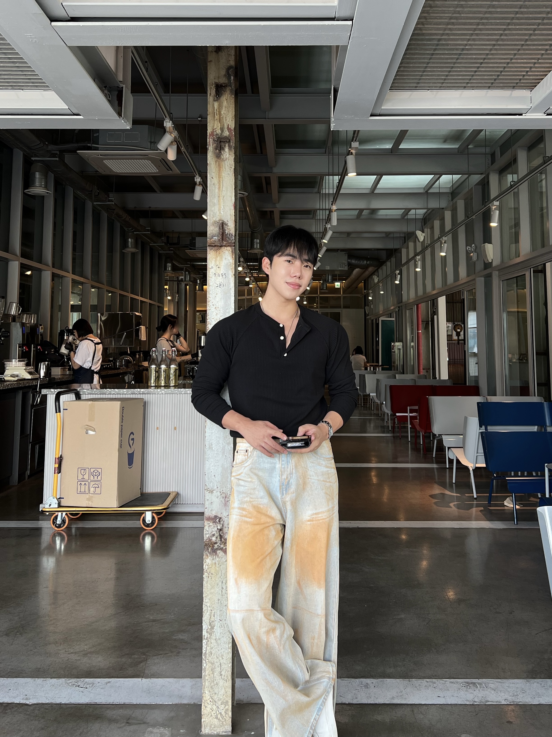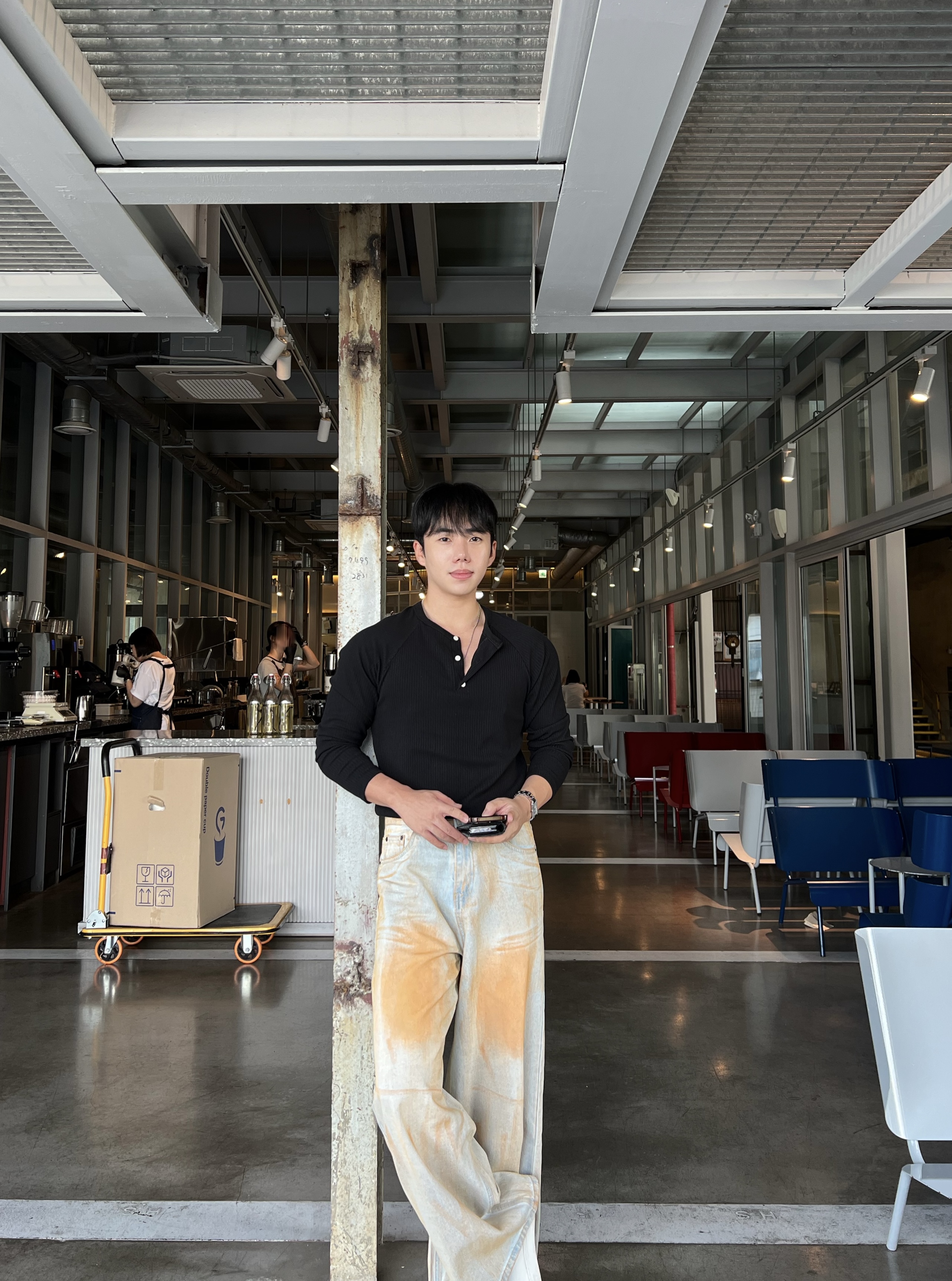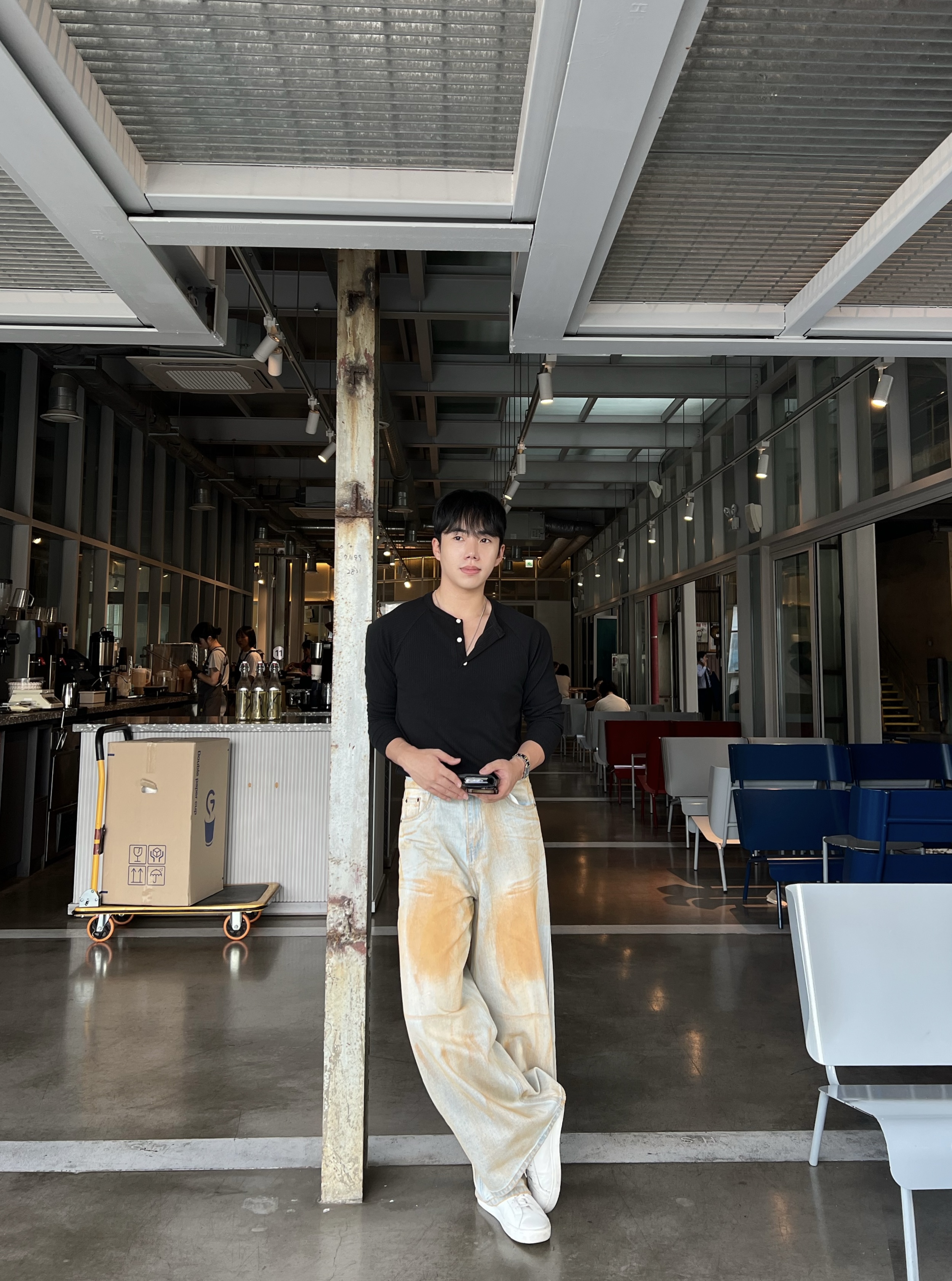 - 헨리넥 버튼 디테일로 베이직한 무드에 감각적인 포인트 더함