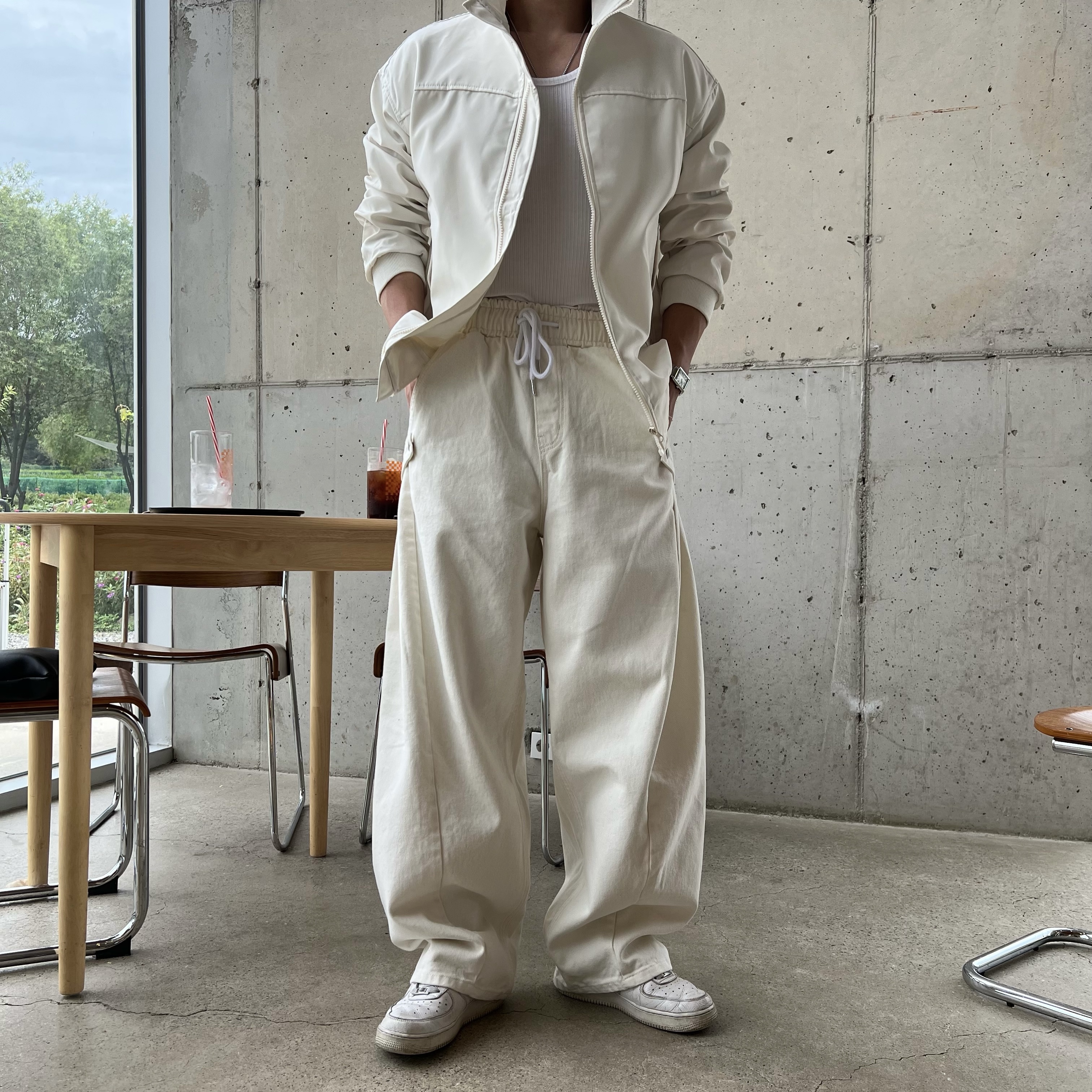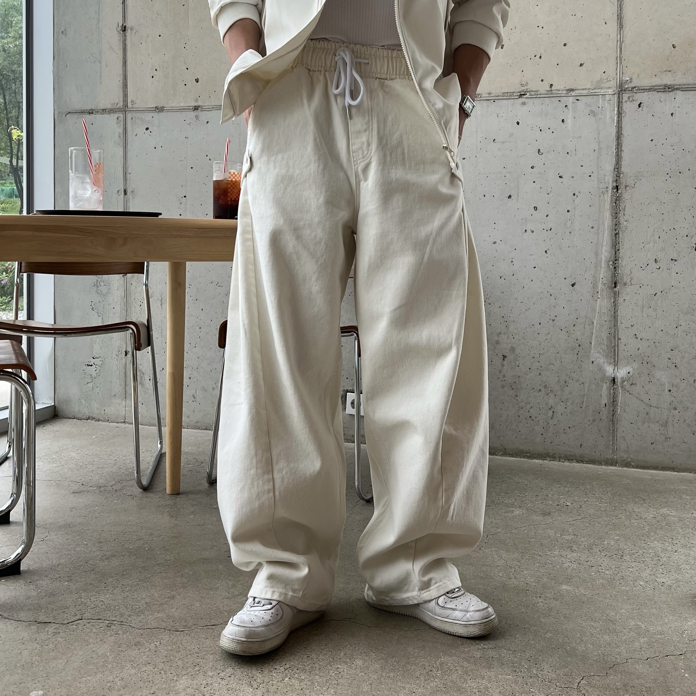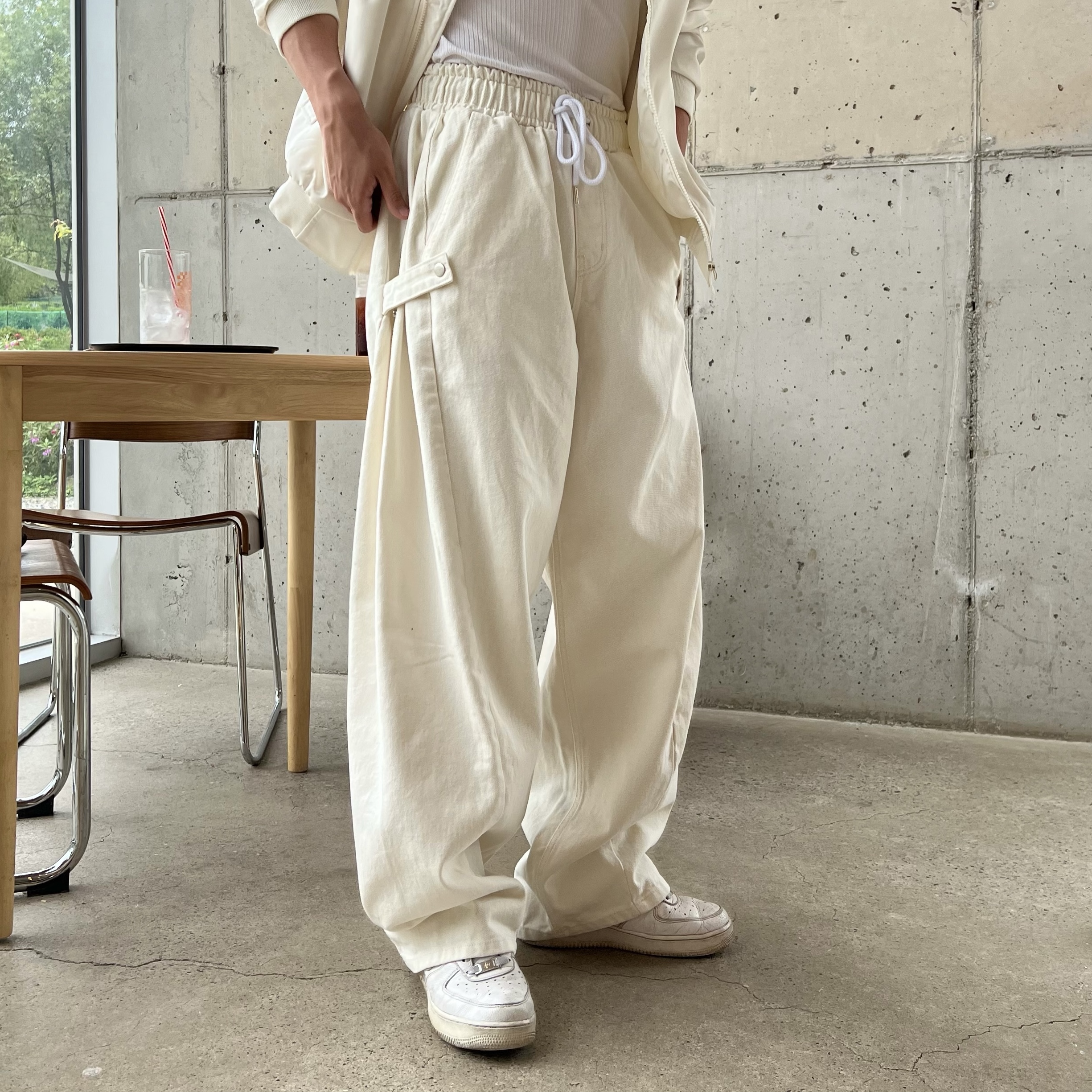 - 안정감 있는 밴딩 처리와 스트링으로 사이즈 조절 가능, 편안한 착용감 제공