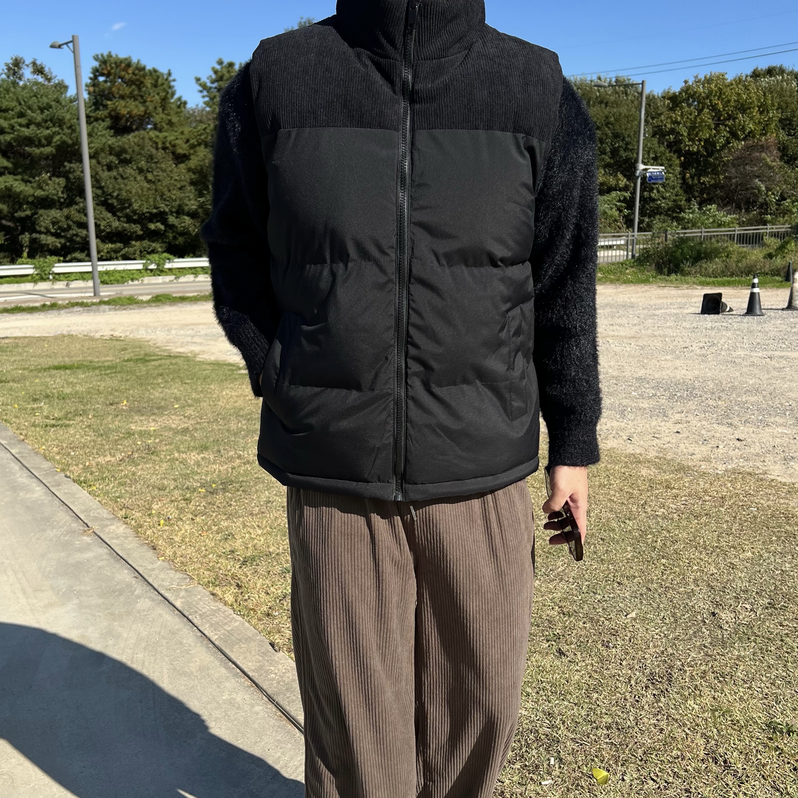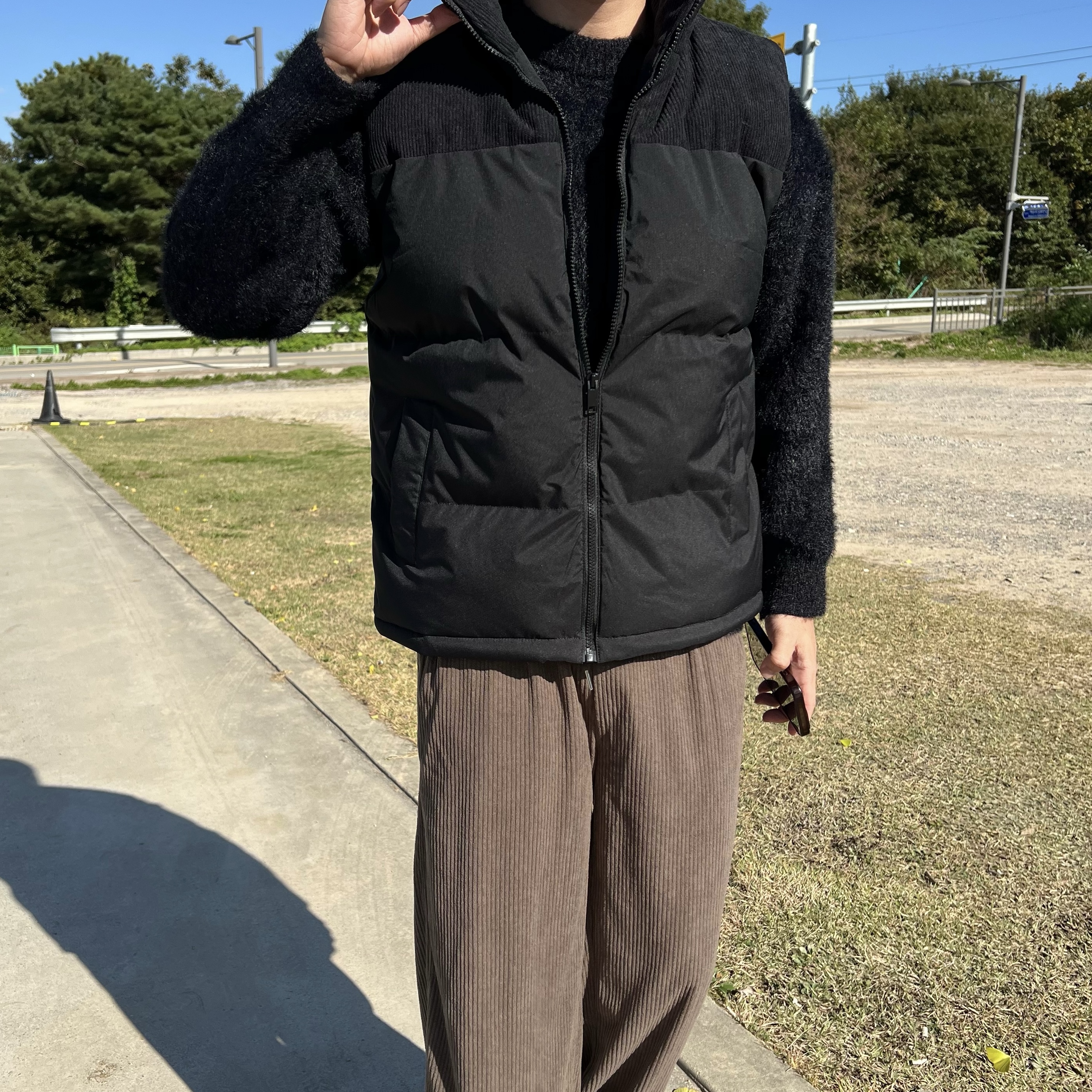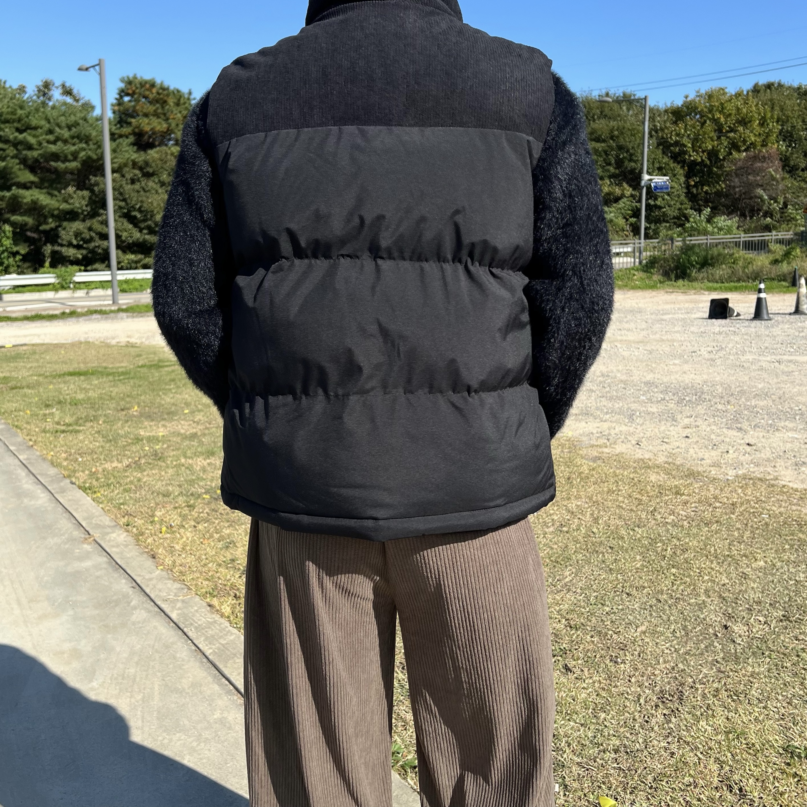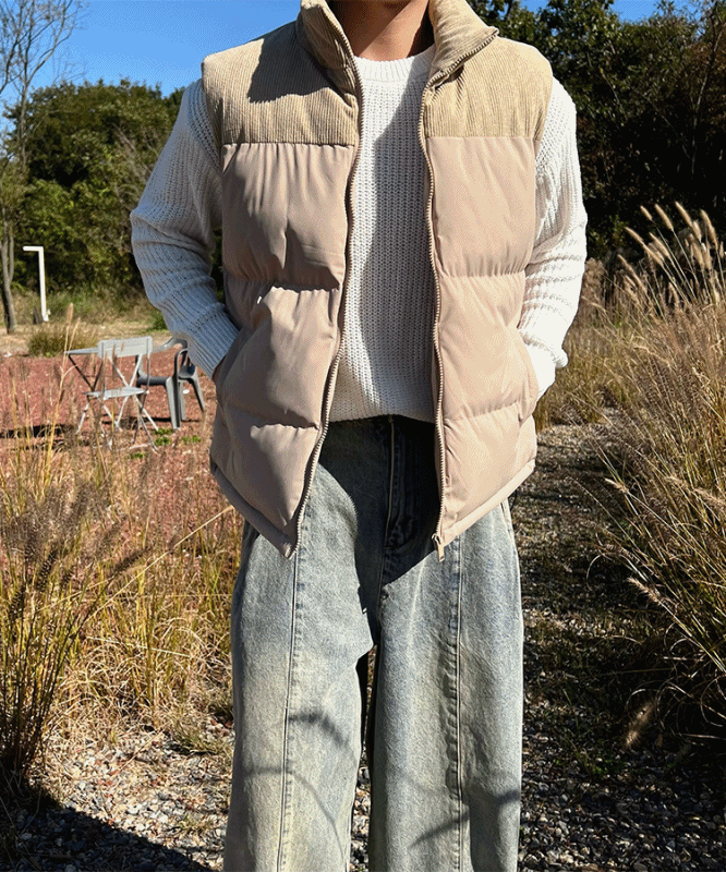 - 코듀로이 배색 디테일로 숄더라인부터 넥라인까지 감싸주는 코듀로이 원단으로 따뜻한 무드 연출