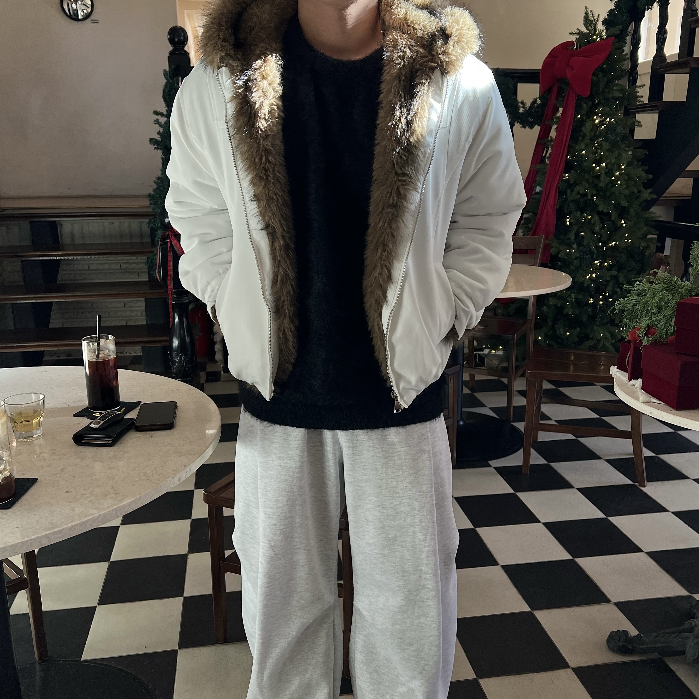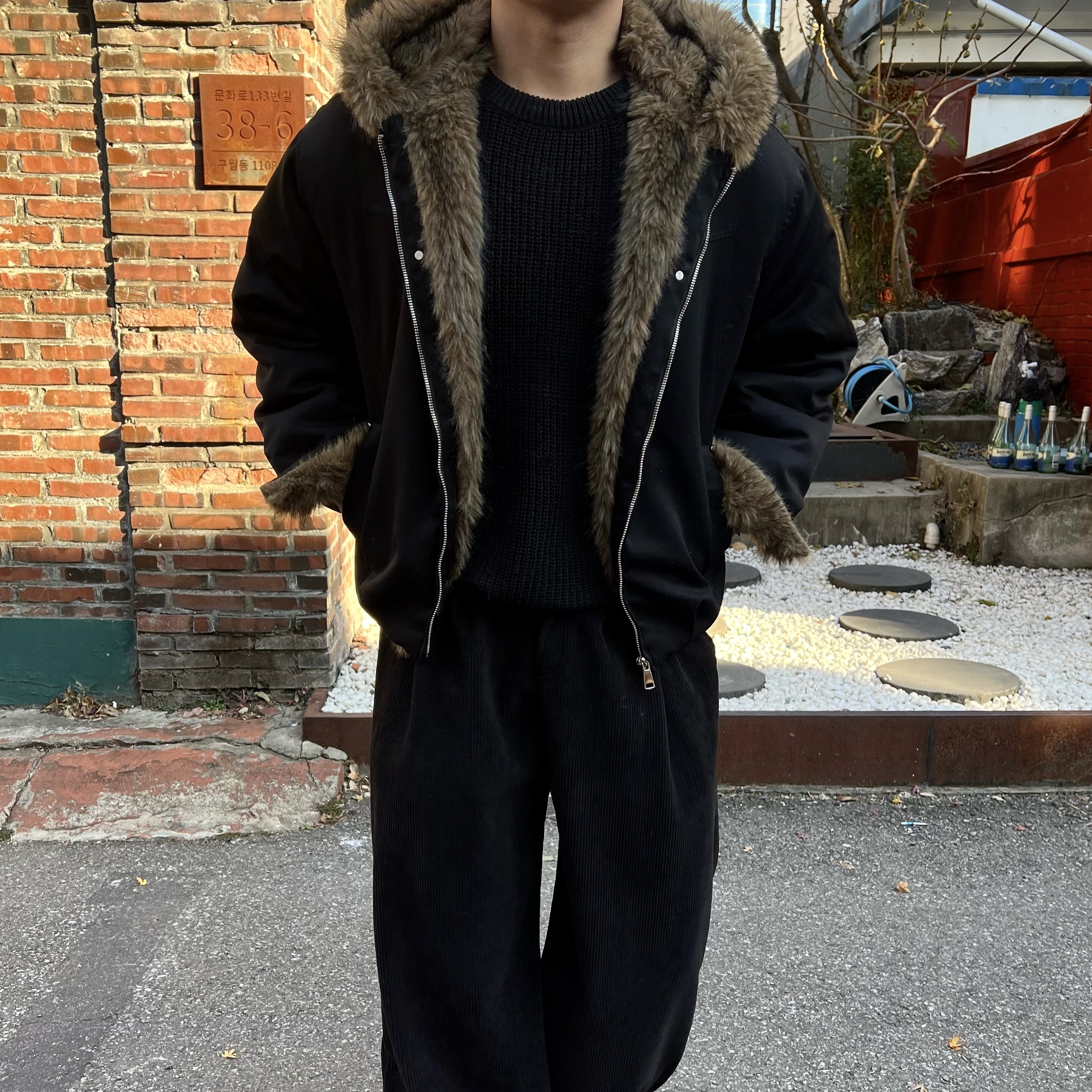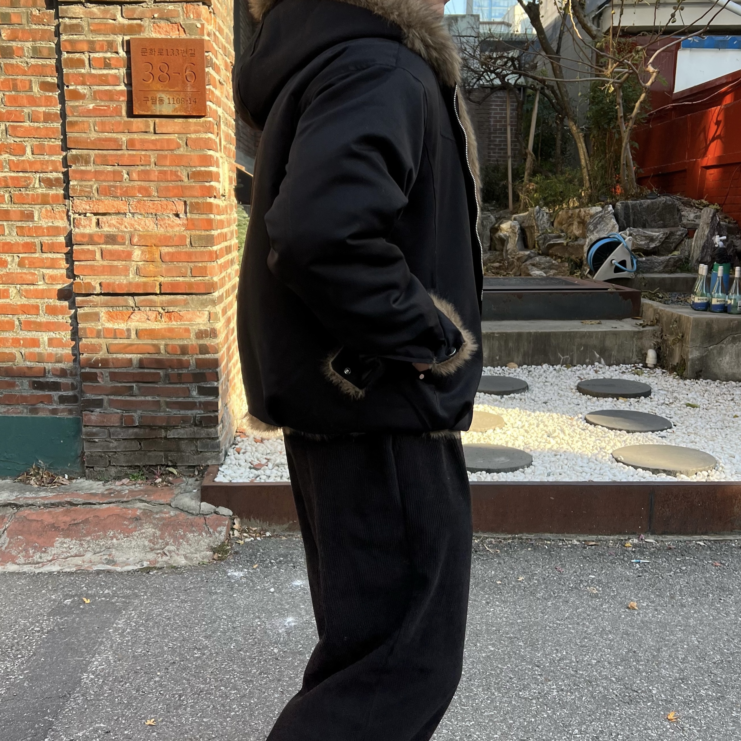 - 풍성한 퍼가 얼굴을 자연스럽게 감싸주며 겨울 무드를 극대화하는 시그니처 포인트