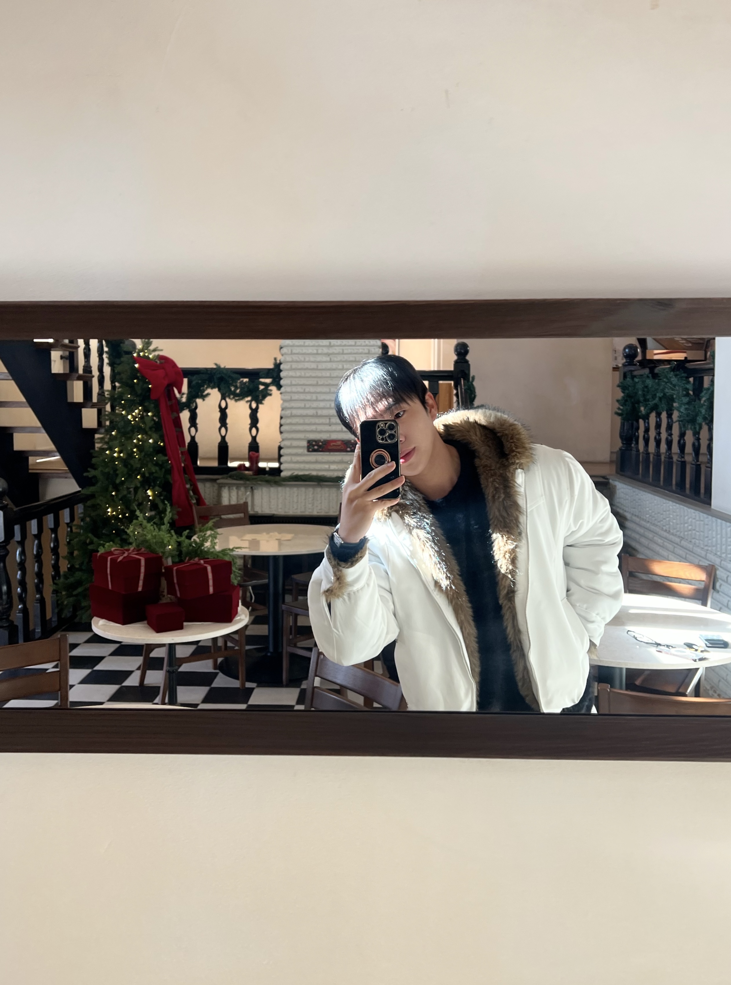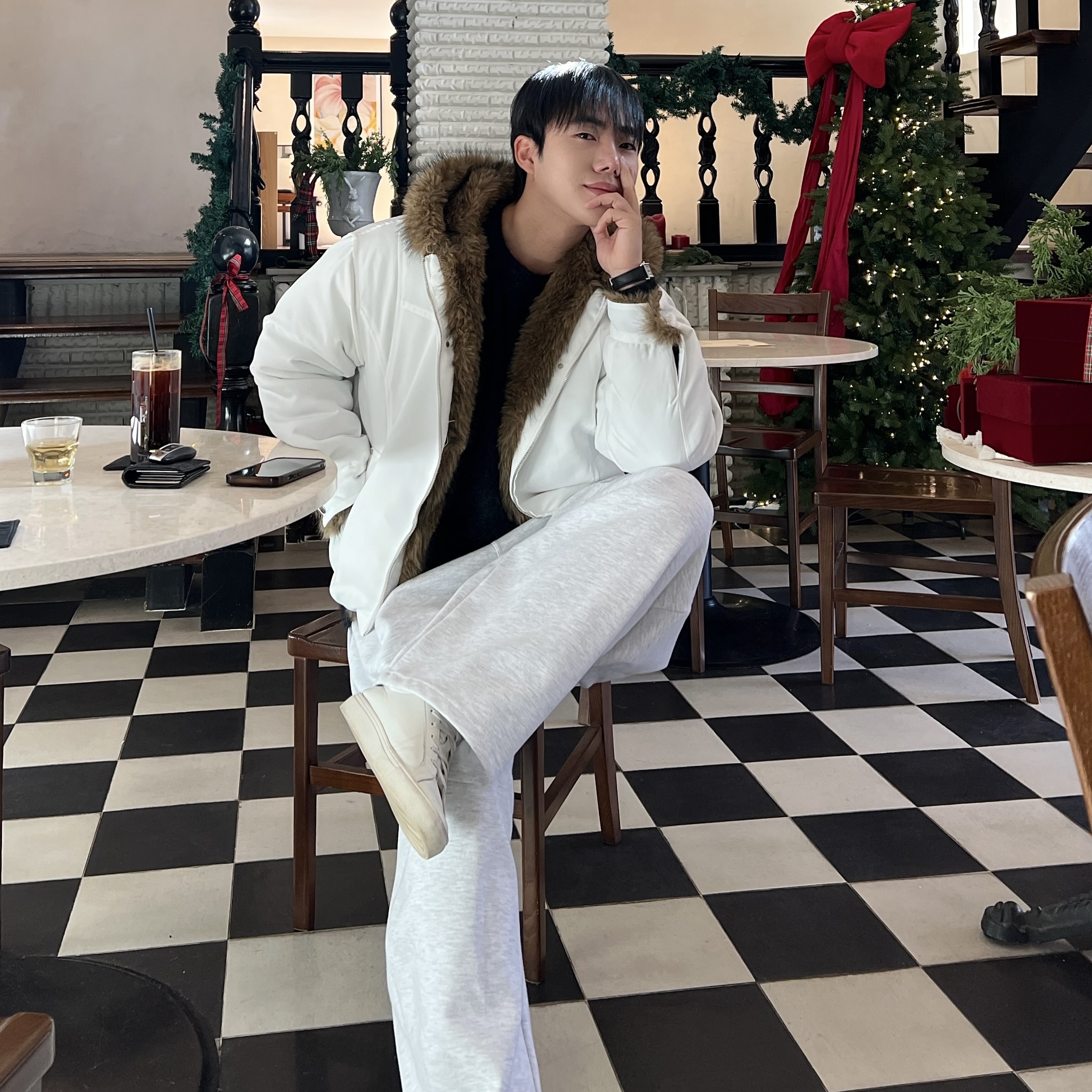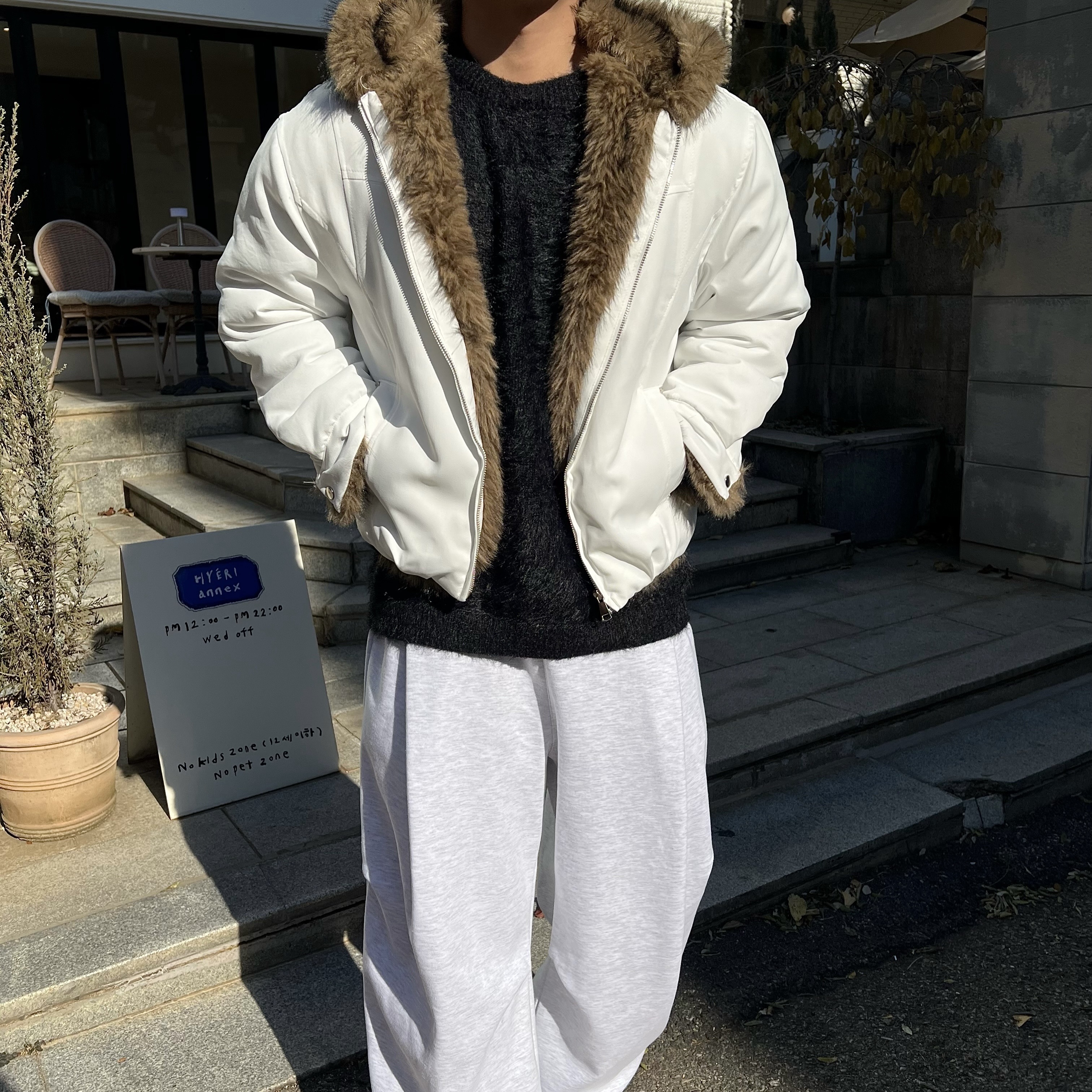 - 풍성한 퍼가 얼굴을 자연스럽게 감싸주며 겨울 무드를 극대화하는 시그니처 포인트