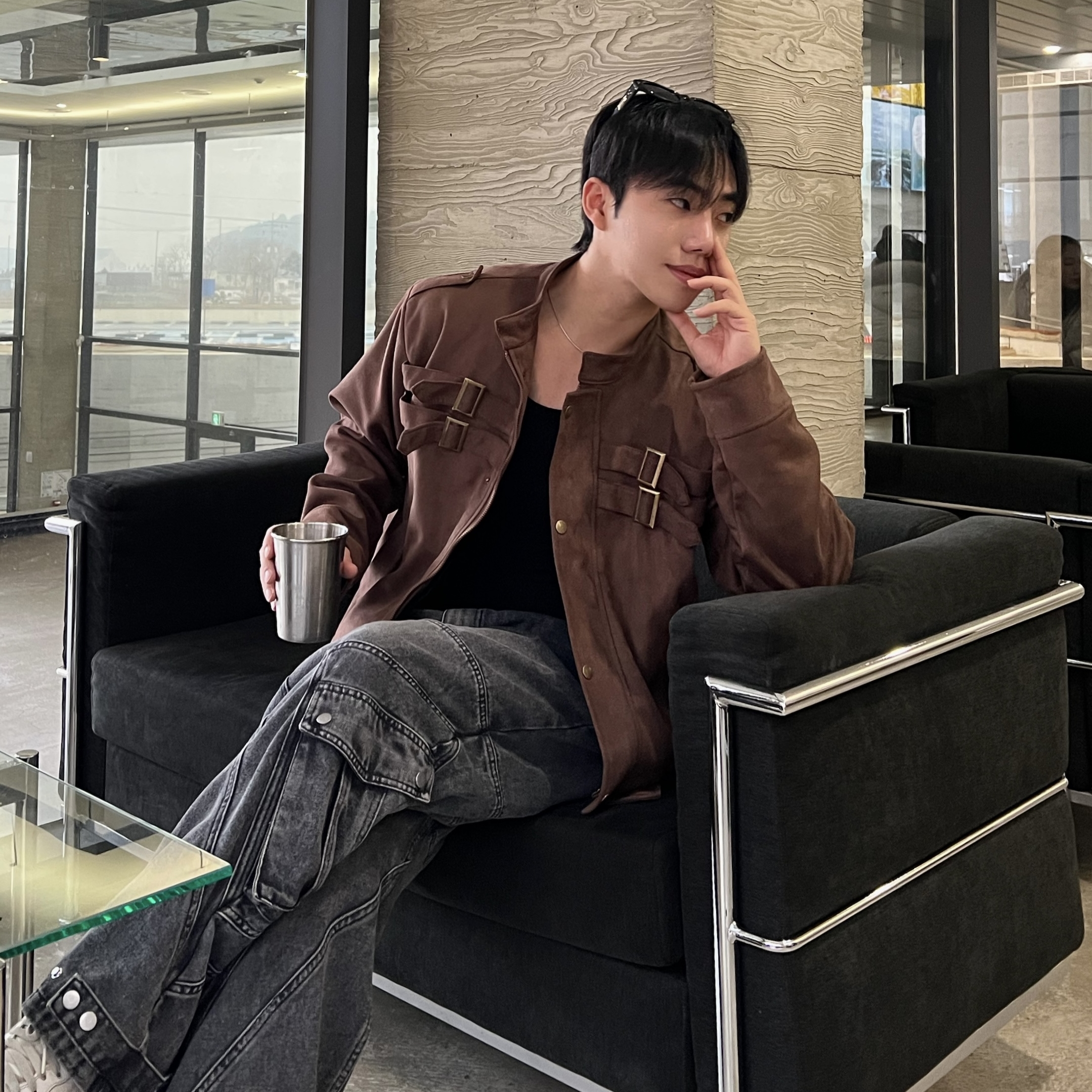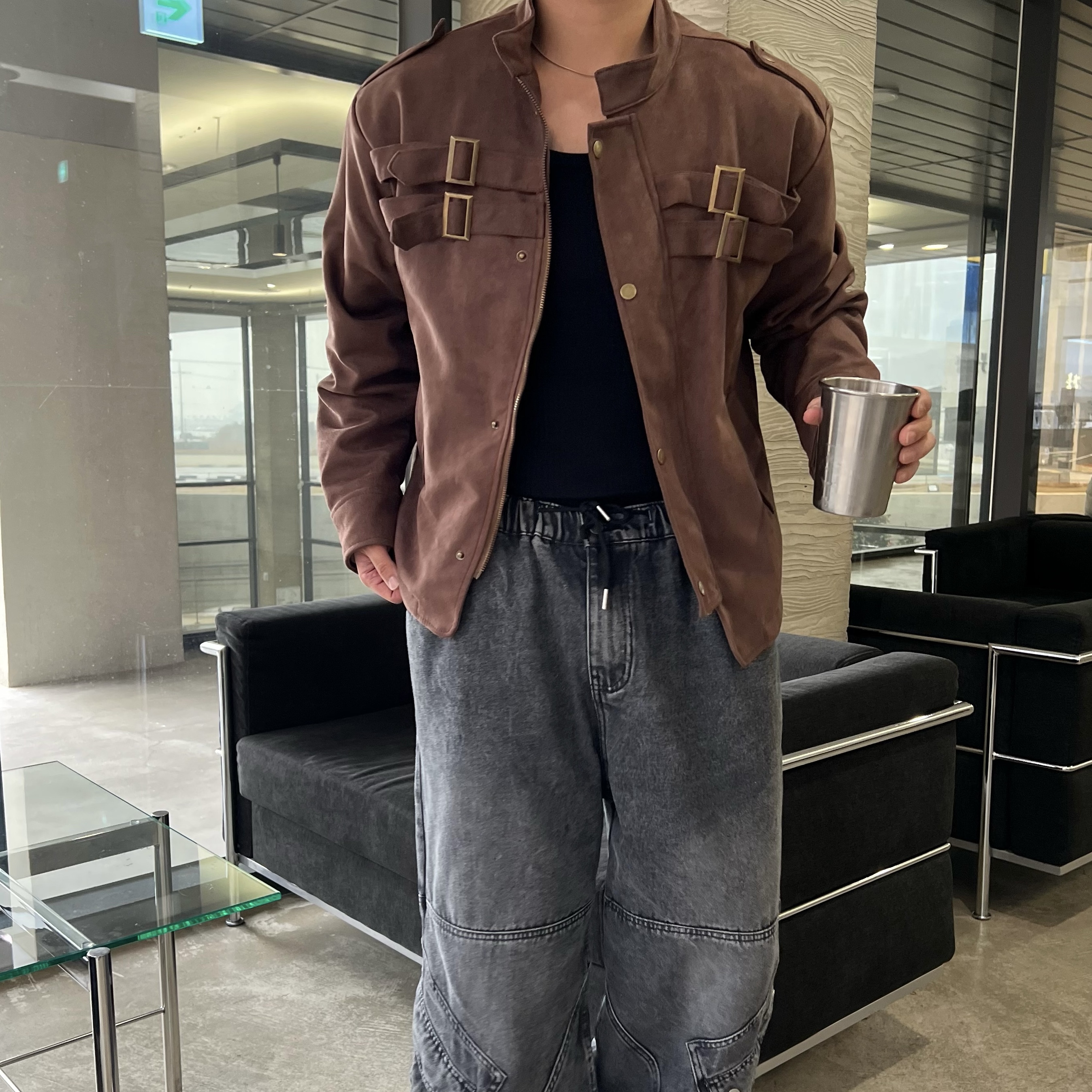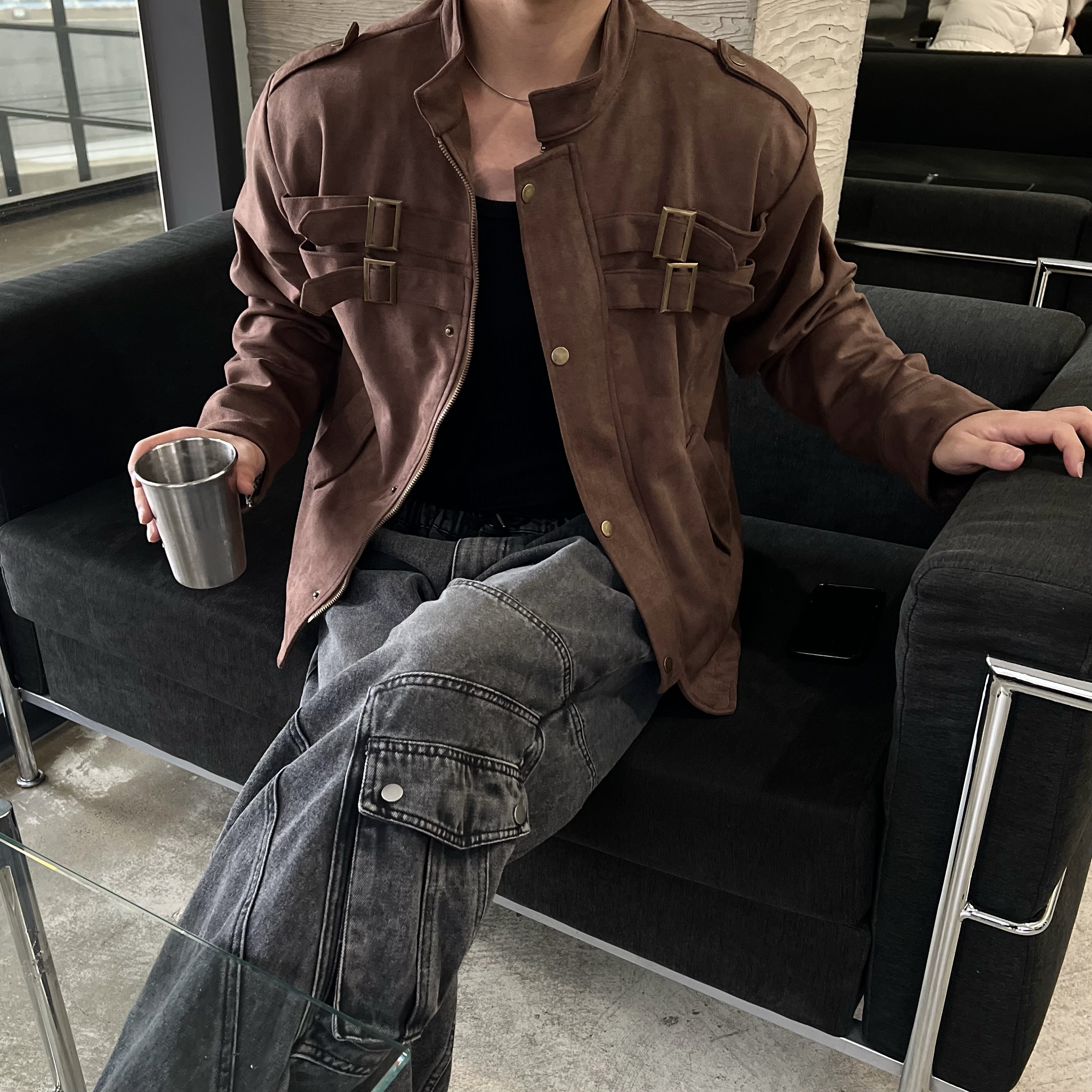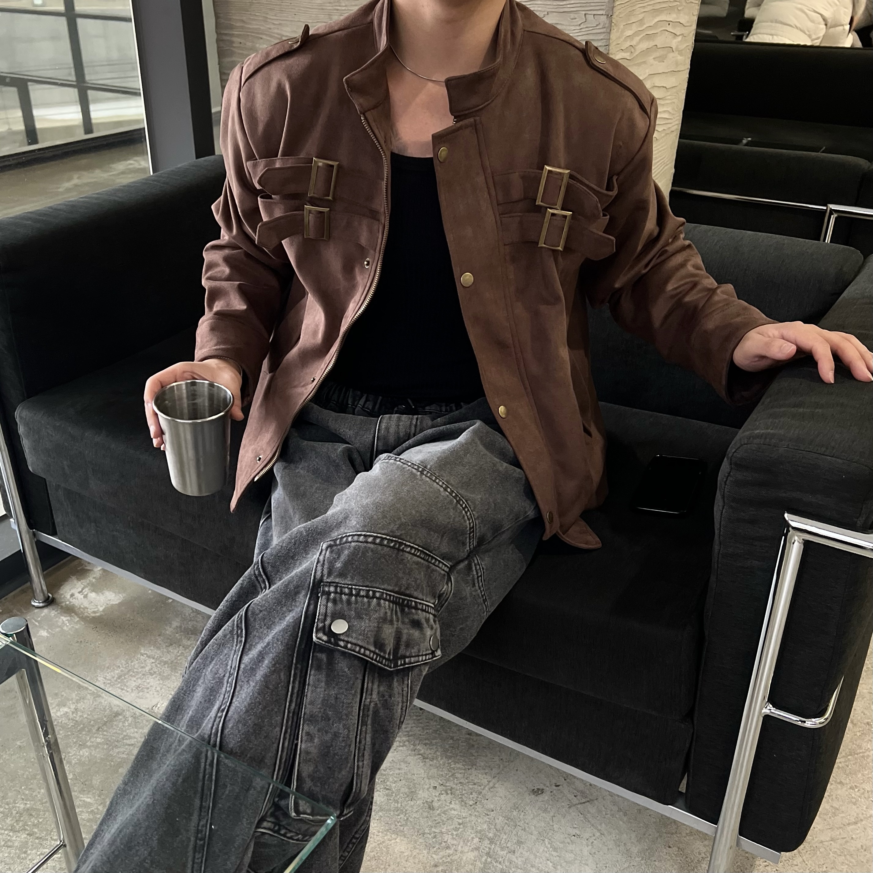 - 딥 브라운 컬러 자켓 톤 다운된 브라운으로 남성적인 무드 + 고급스러운 분위기