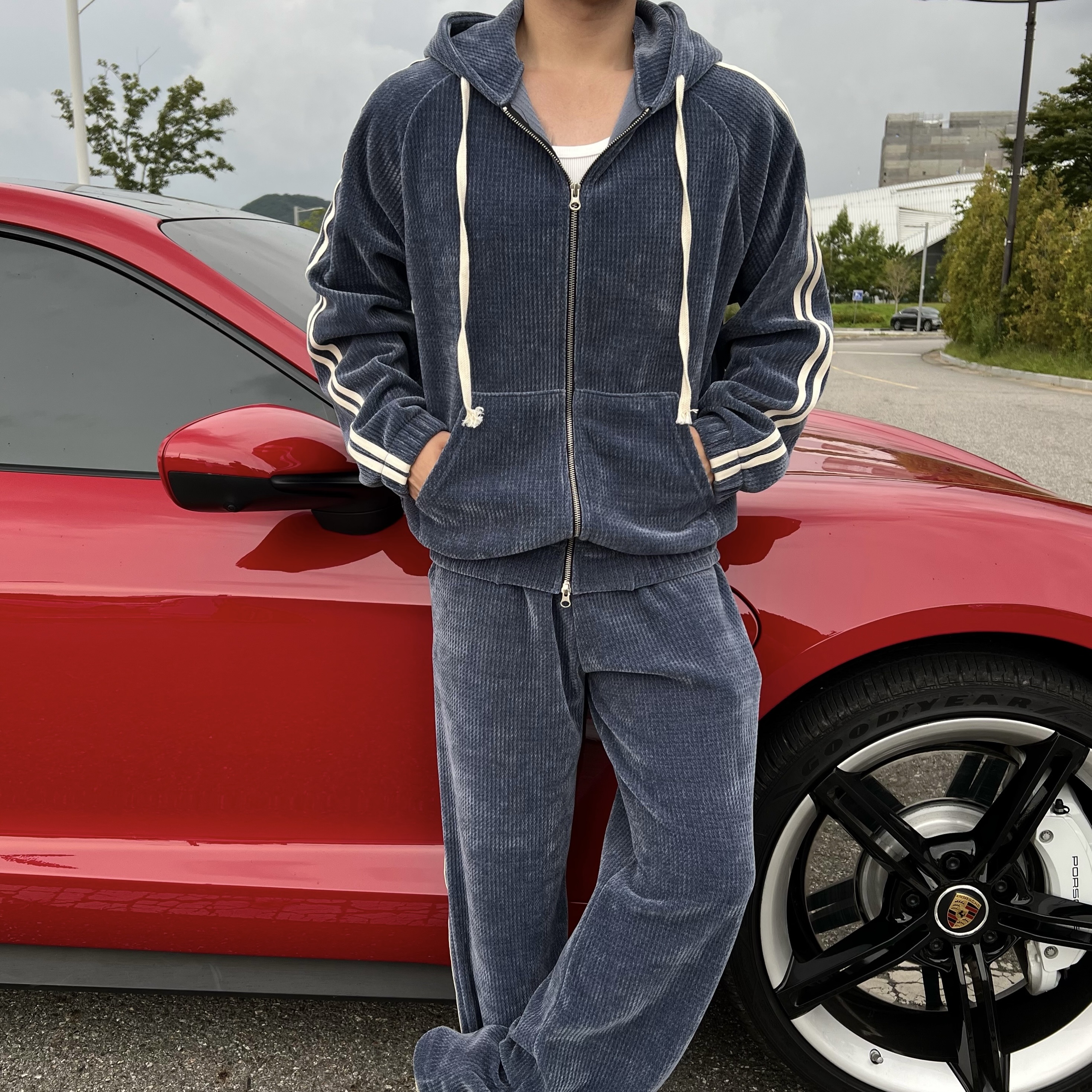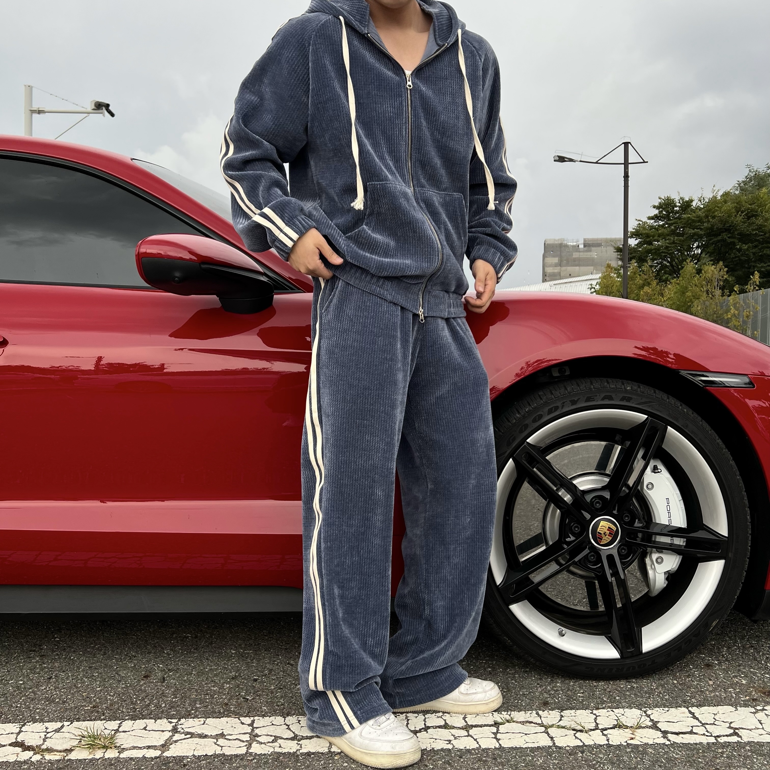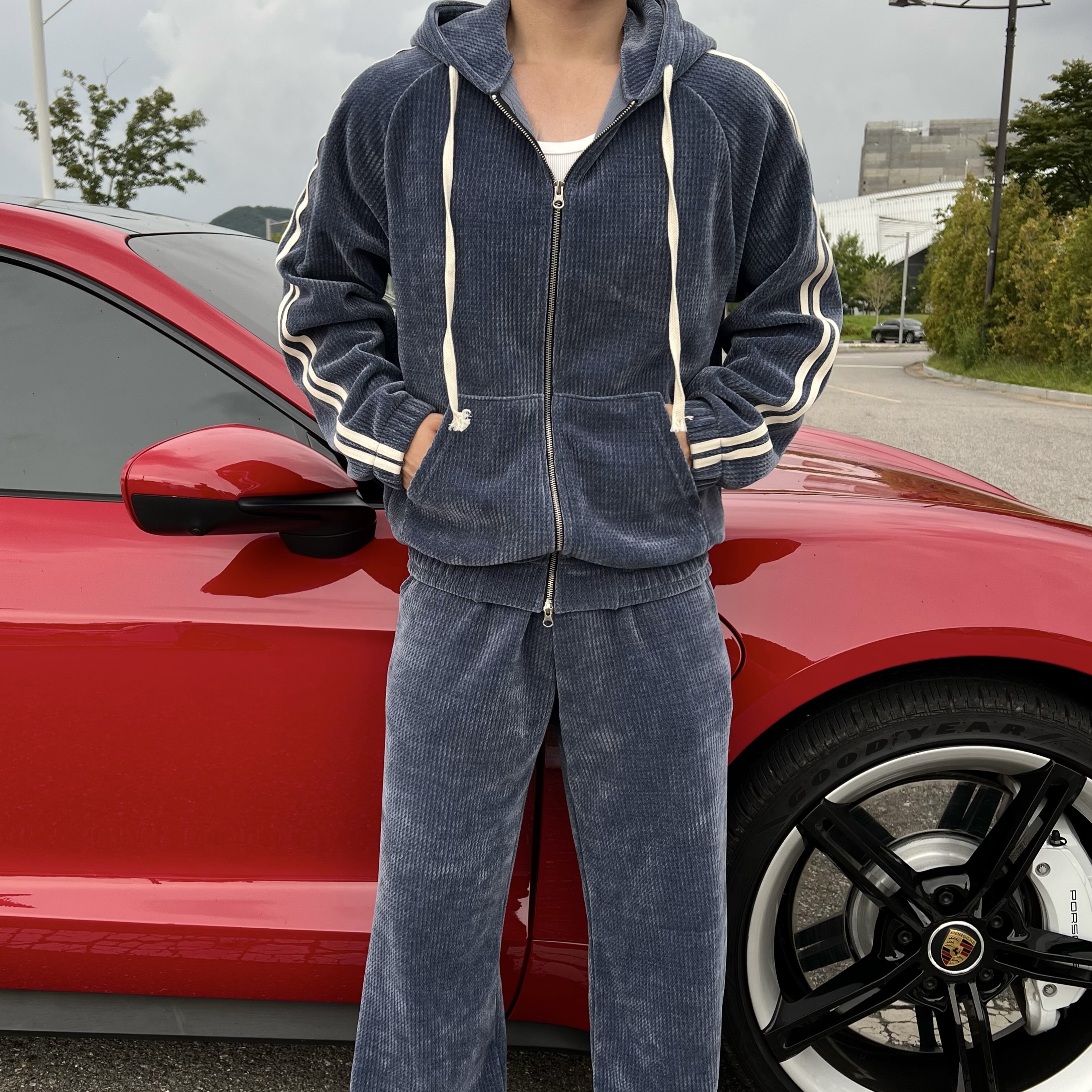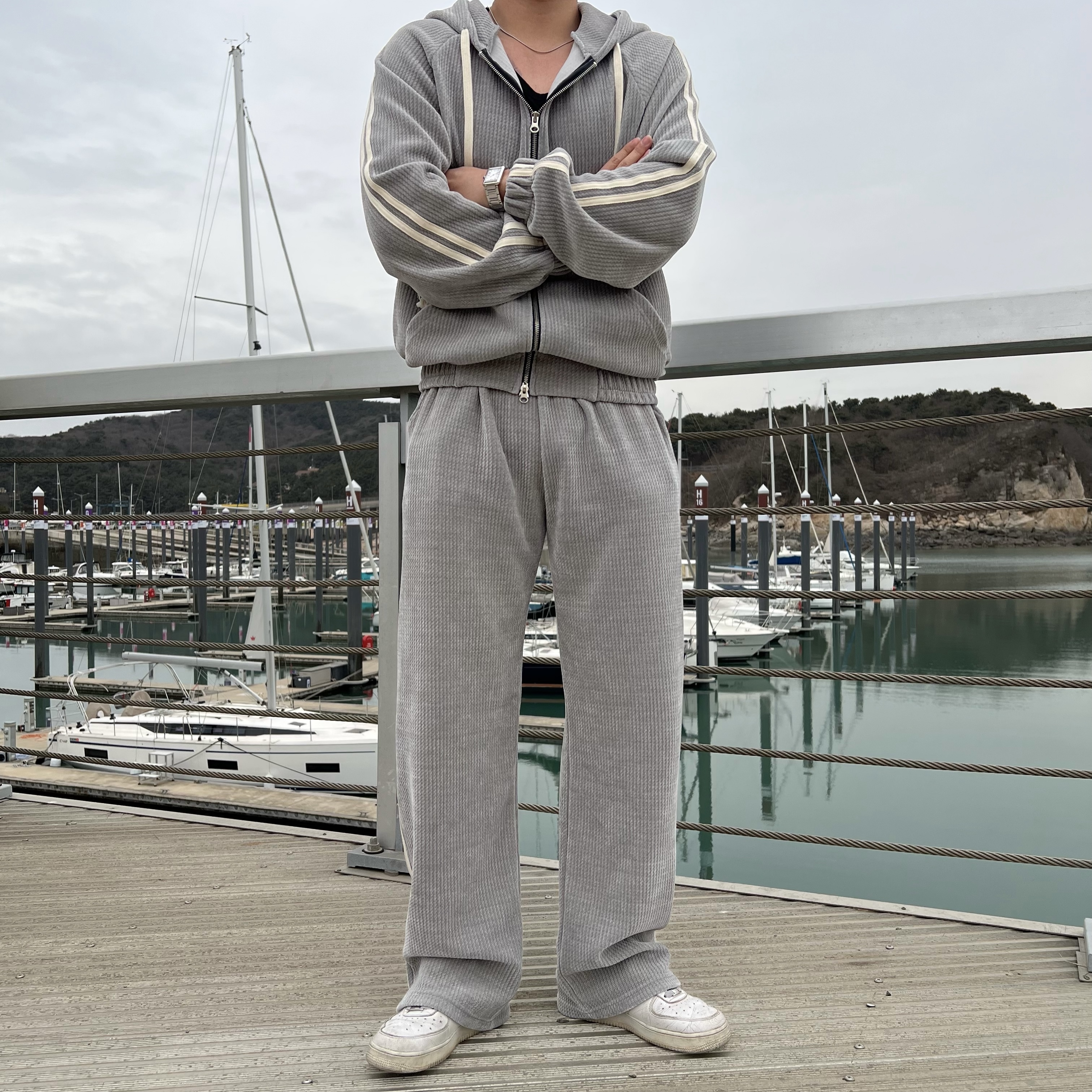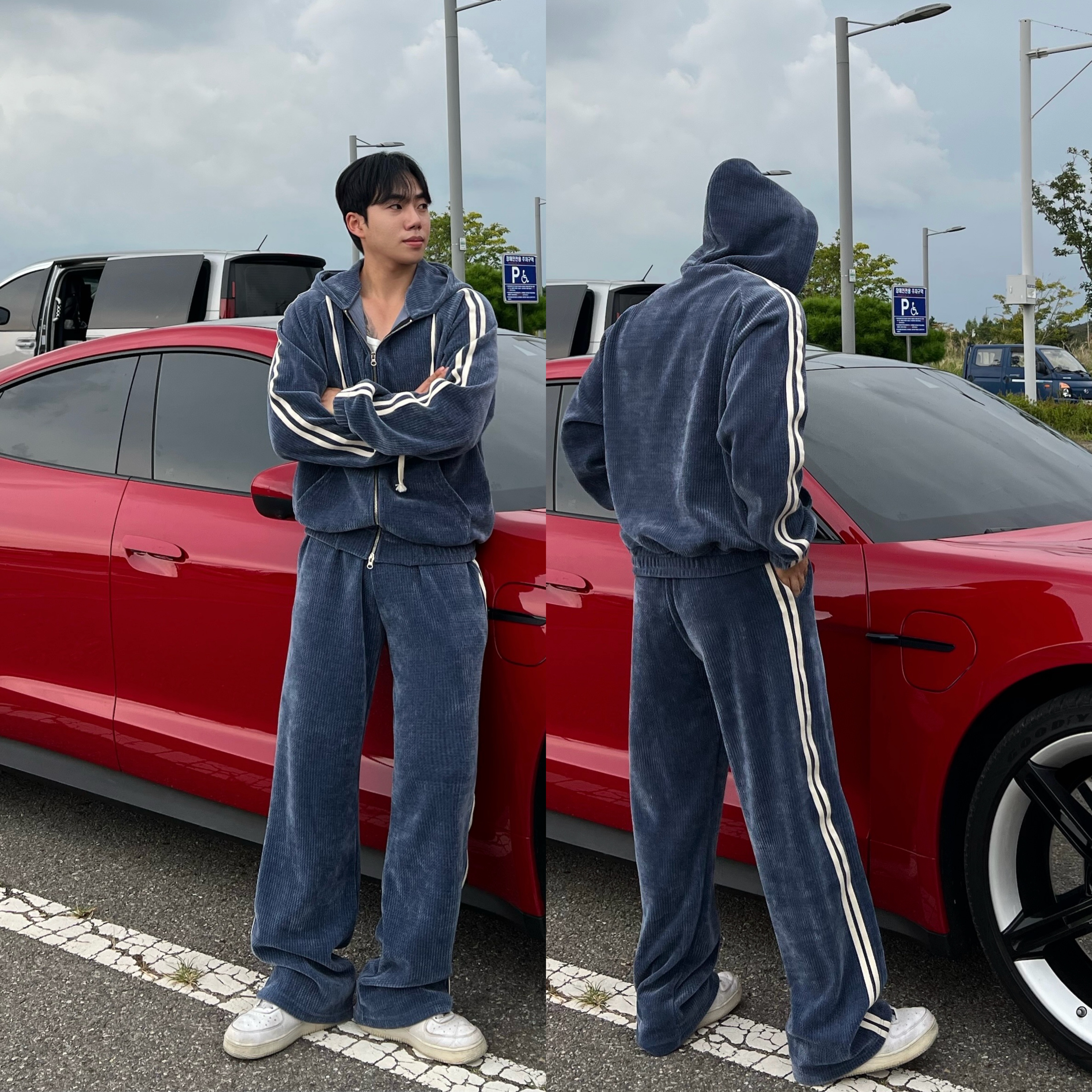 - 후드 집업 + 팬츠 셋업 구성으로 올인원으로 완벽한 트레이닝룩 완성