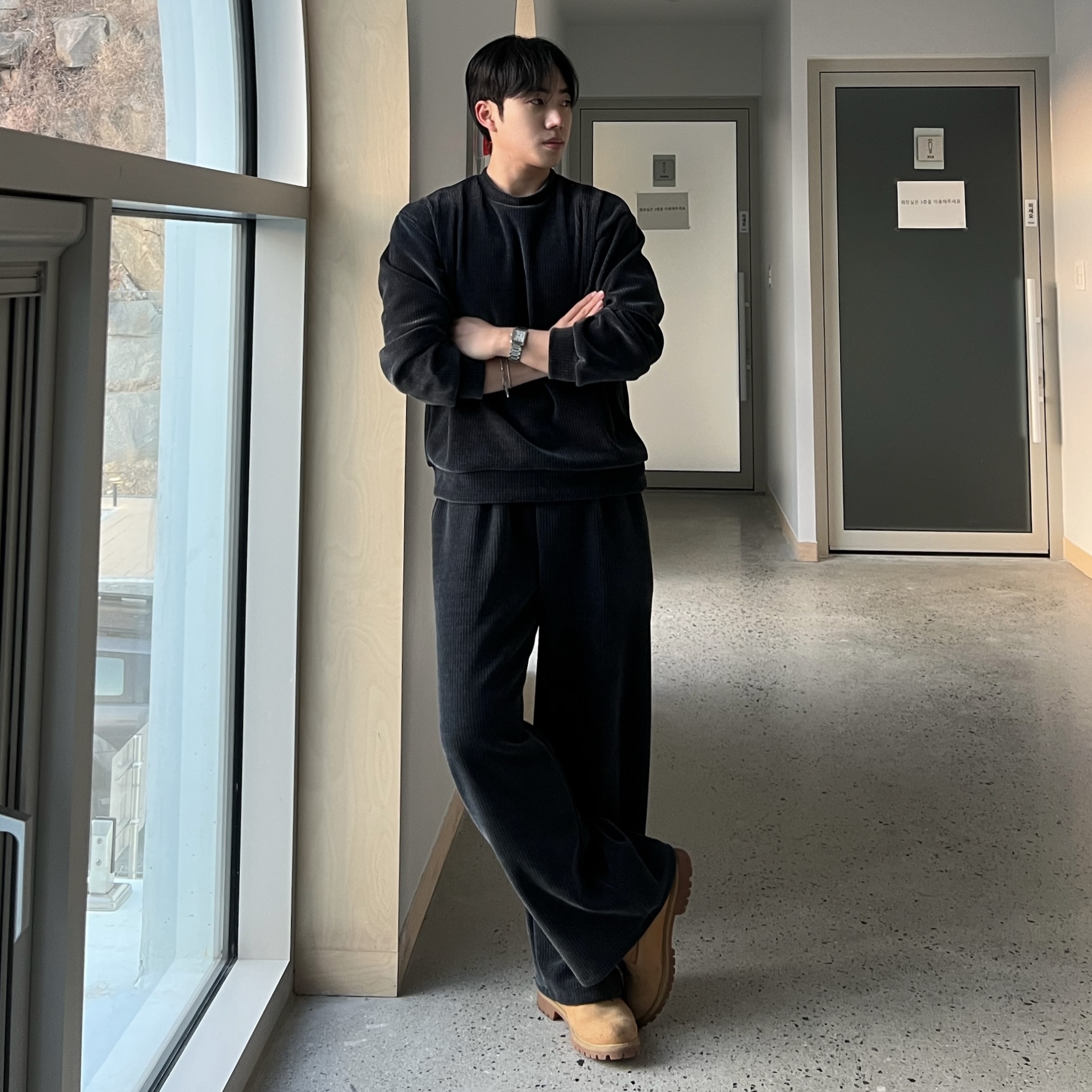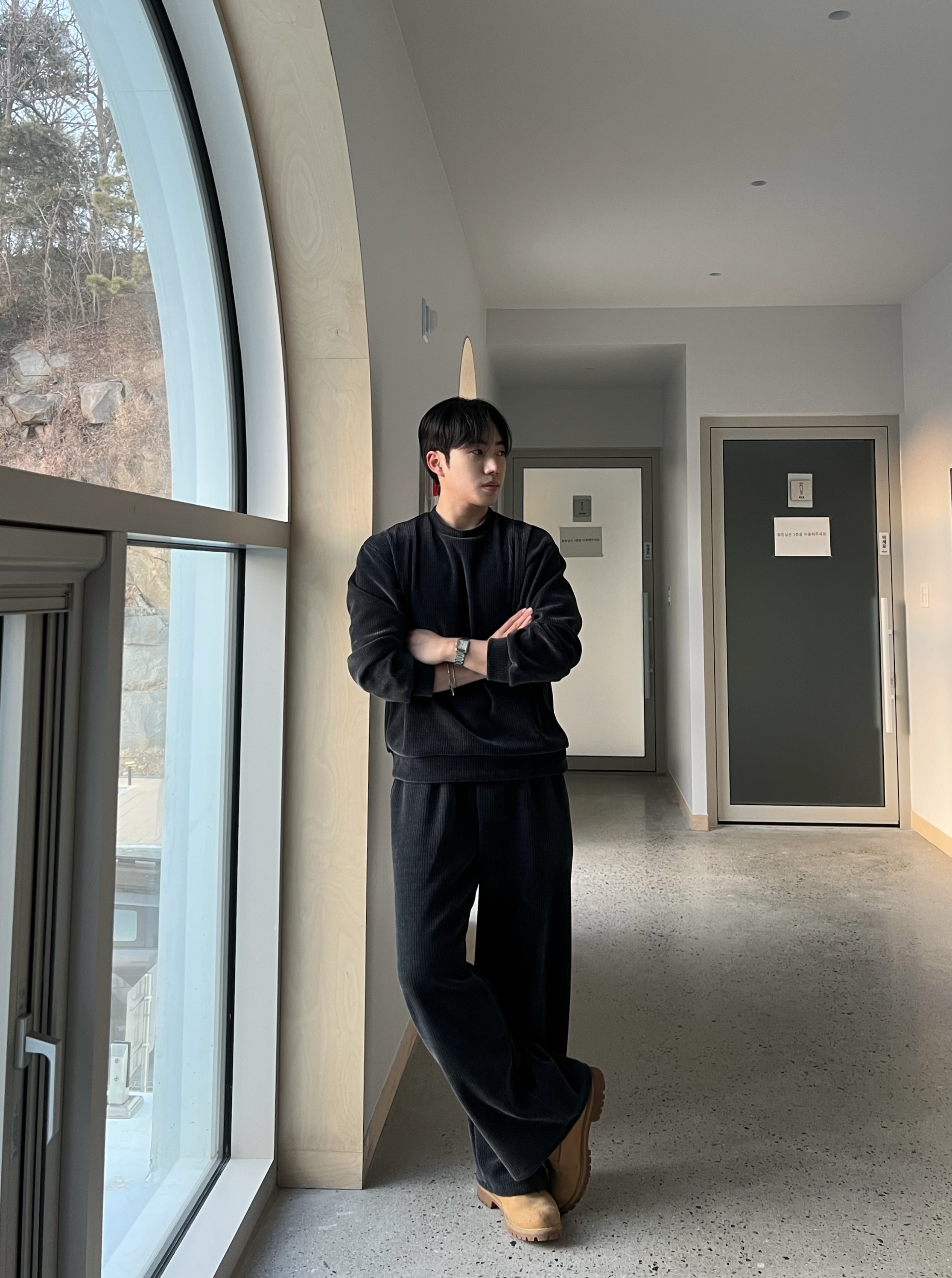 - 맨투맨 + 팬츠 세트로 간편하면서도 완성도 높은 코디 가능